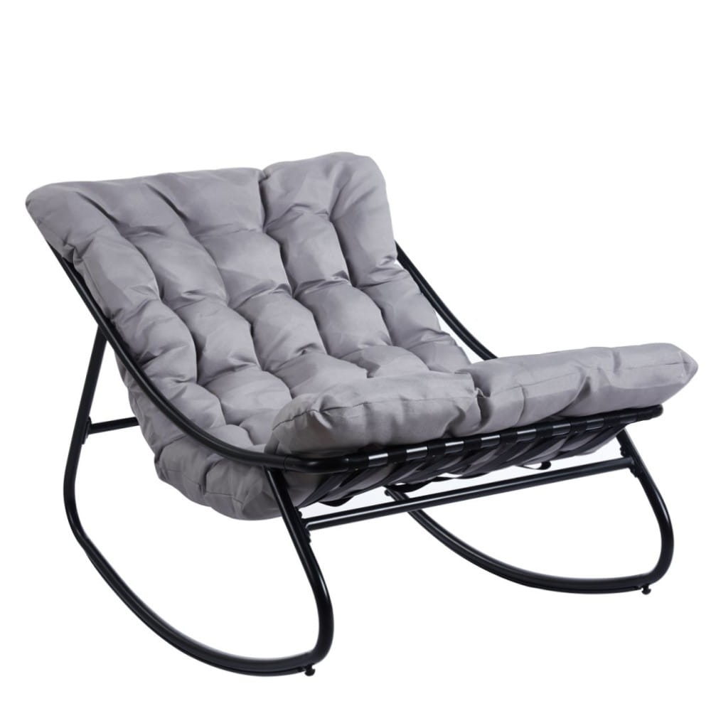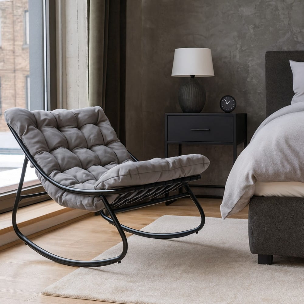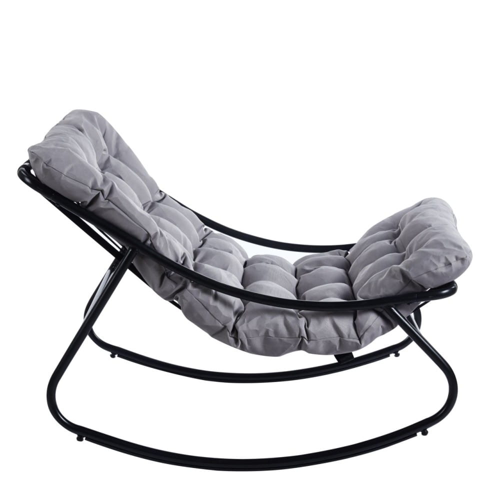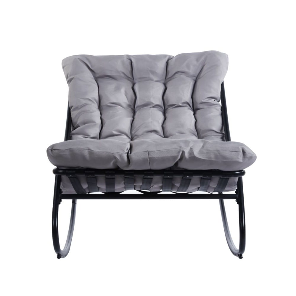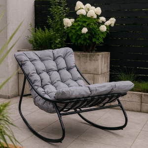 RELAXO to wygodny fotel bujany z miękką poduchą w szarym kolorze. Idealny do relaksu w salonie, sypialni, a także na tarasie czy w ogrodzie.