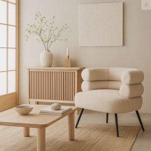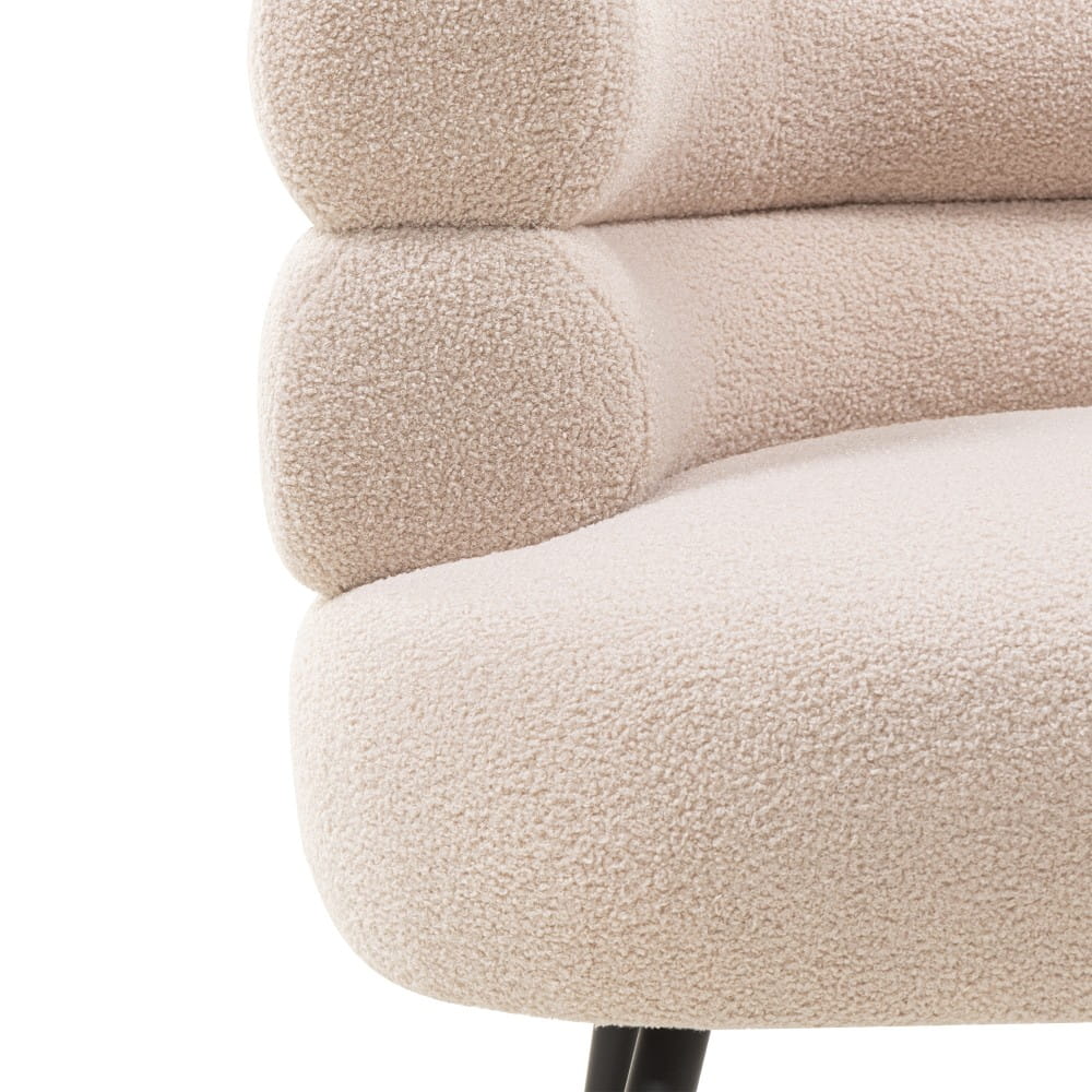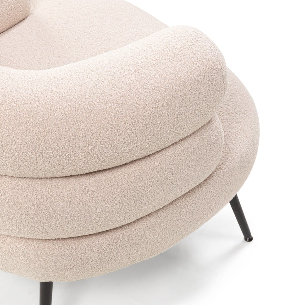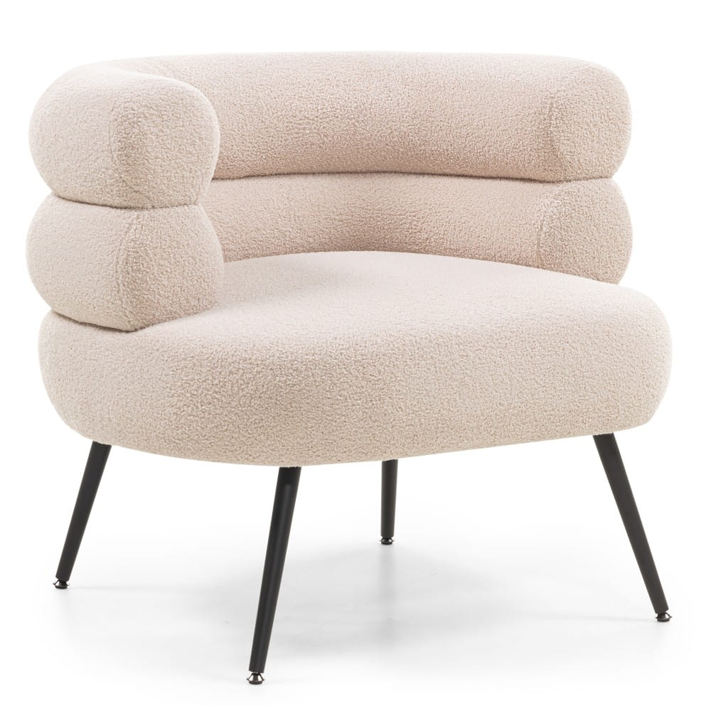 Fotel LEYA przyciąga wzrok dzięki niepowtarzalnemu kształtowi oparcia, które składa się z miękkich, poziomych wałków. Tapicerowany luksusową tkaniną w ciepłym odcieniu beżowym, doskonale łączy nowoczesną estetykę z przytulnością. Cztery smukłe nóżki z czarnego metalu dodają całości lekkości i elegancji.
