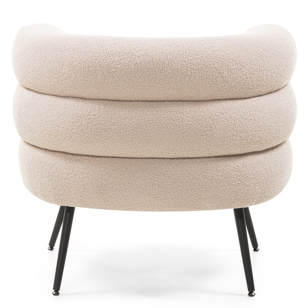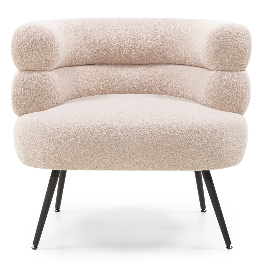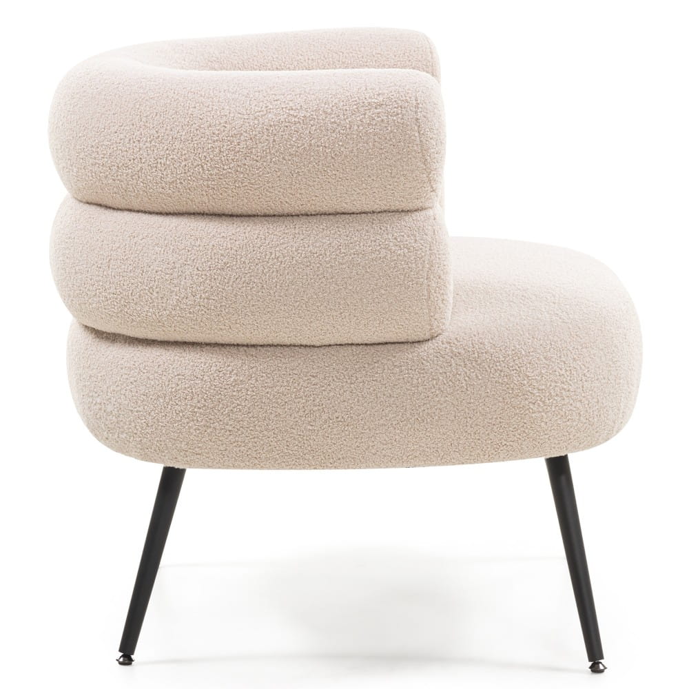 Designerski fotel LEYA tapicerowany miękką tkaniną w kolorze beżowym. Zachwyca nietuzinkowym oparciem oraz lekką formą na czarnych metalowych nóżkach. Idealny do salonu, lobby, sypialni lub strefy relaksu.