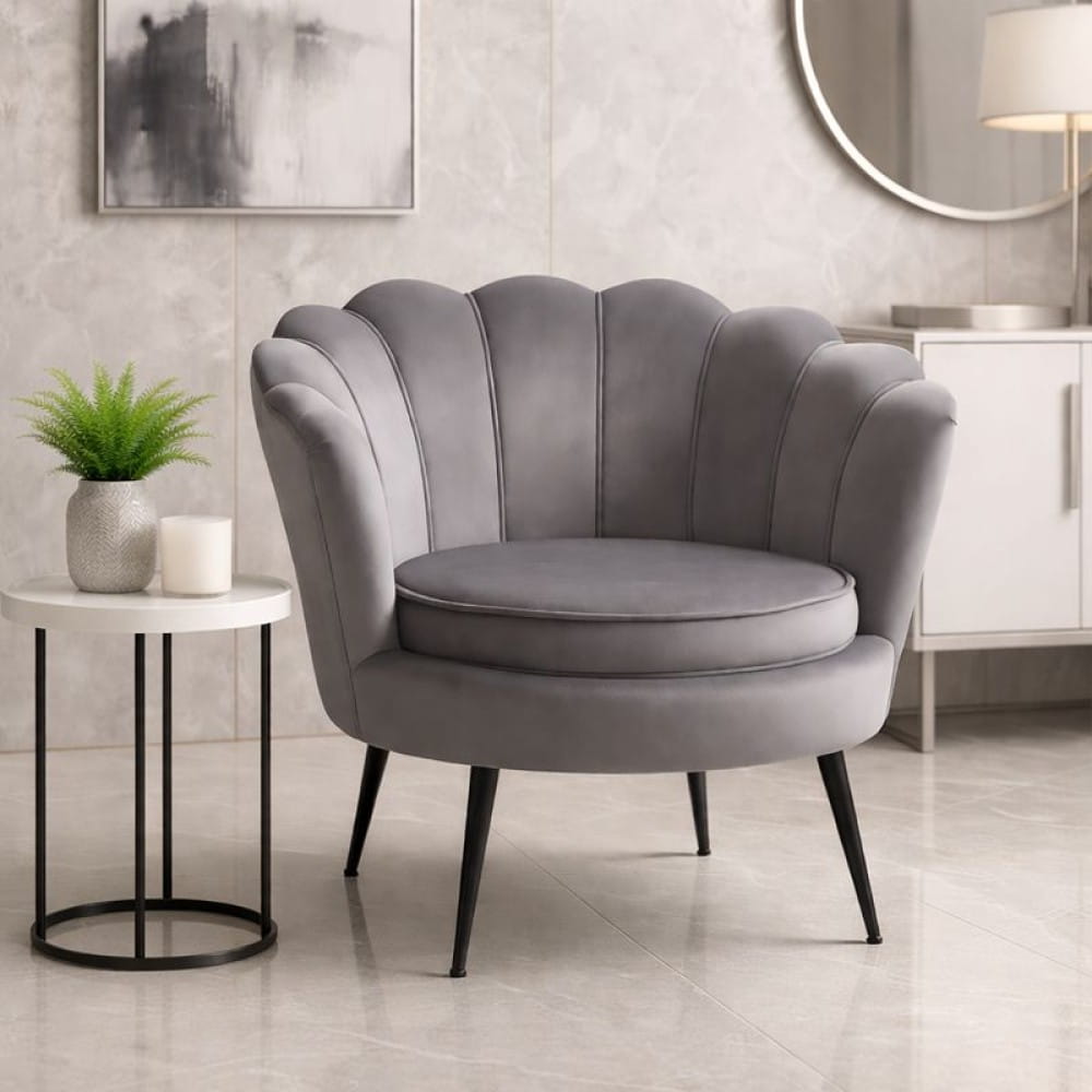 Muszelkowa forma sprawia, że fotel pełni nie tylko funkcję użytkową, ale również dekoracyjną. Doskonale wygląda obok sof, stolików glamour oraz jako akcent w przytulnym kąciku wypoczynkowym.