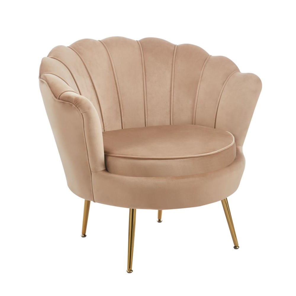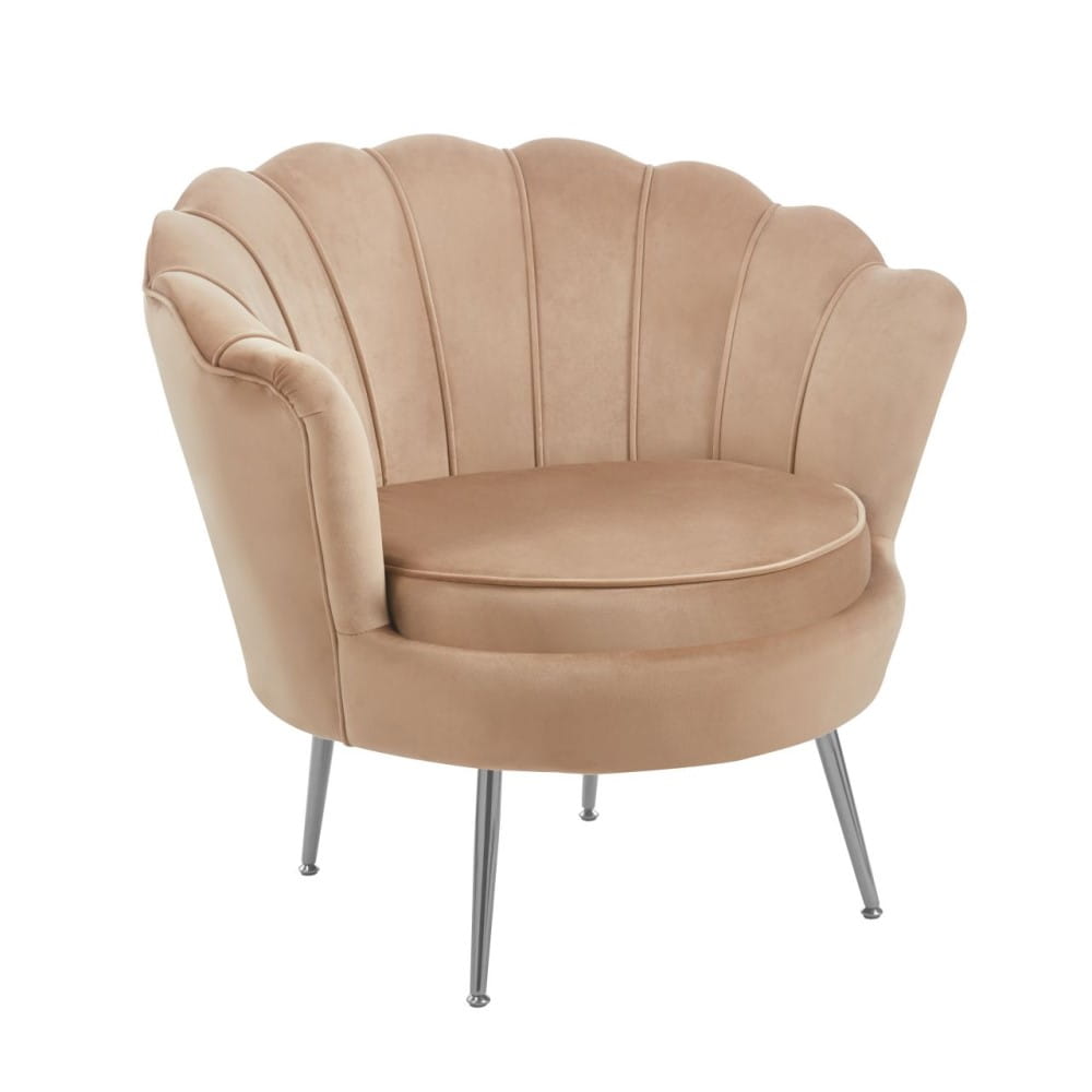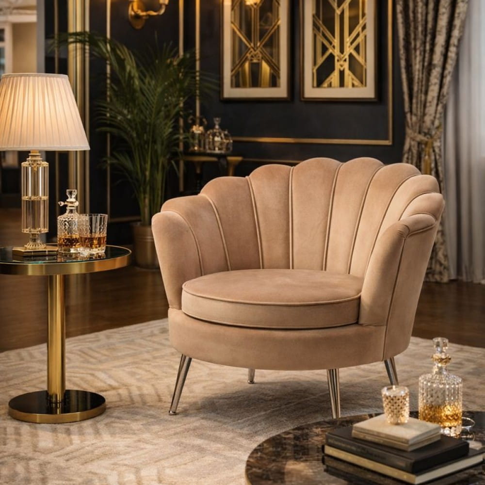 Fotel Muszelka Cappuccino – welurowy fotel glamour z metalowymi nogami
