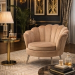 Model o charakterystycznym muszelkowym oparciu łączy dekoracyjną formę z codziennym komfortem. Zaokrąglone linie i miękkie wykończenie sprawiają, że fotel wygląda lekko, a jednocześnie daje poczucie otulenia podczas siedzenia.