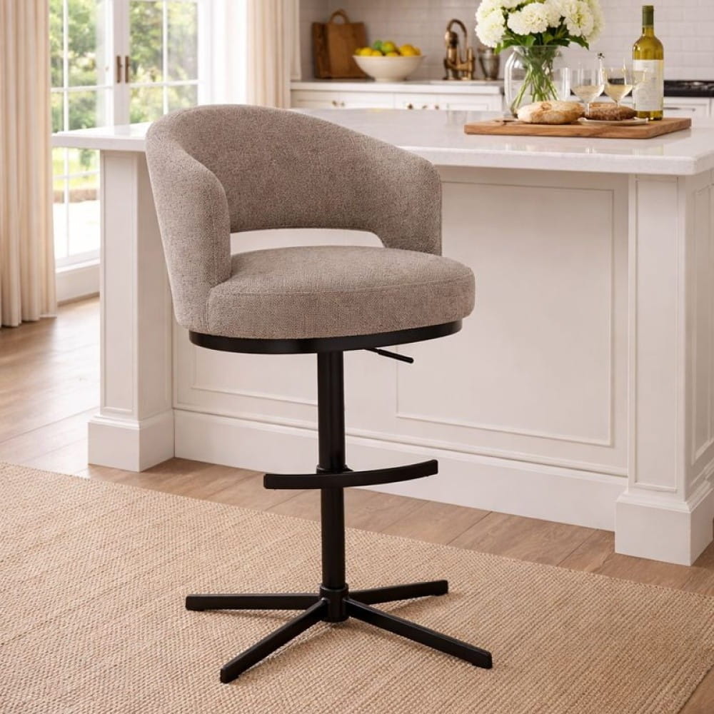 Hoker HAGA Cross to komfortowy, tapicerowany hoker z funkcją obrotu 360° i regulacją wysokości. Siedzisko oparte na sprężynach kieszeniowych i piance zapewnia wygodę jak w fotelu, a metalowa podstawa typu cross nadaje lekkości i nowoczesnego charakteru. Model idealnie sprawdzi się przy wyspie kuchennej i wysokich blatach.