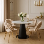 Model BUBBLE w beżowej tapicerce velvet to połączenie lekkości i stylu glamour. Charakterystyczne oparcie z miękkich poduszeczek nadaje mu unikalny wygląd, a złote nogi wprowadzają luksusowy akcent. Idealne do jadalni, salonu lub przy toaletce.