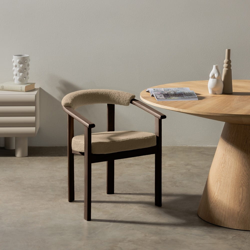 Krzesło MARIS w wybarwieniu orzech okapi i tkaninie boucle Lambi 10 to harmonijne połączenie natury z nowoczesną formą. Styl japandi, miękkie siedzisko i ergonomiczne oparcie czynią z niego doskonały wybór do jadalni i wnętrz z duszą.