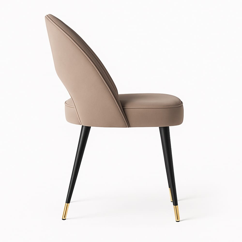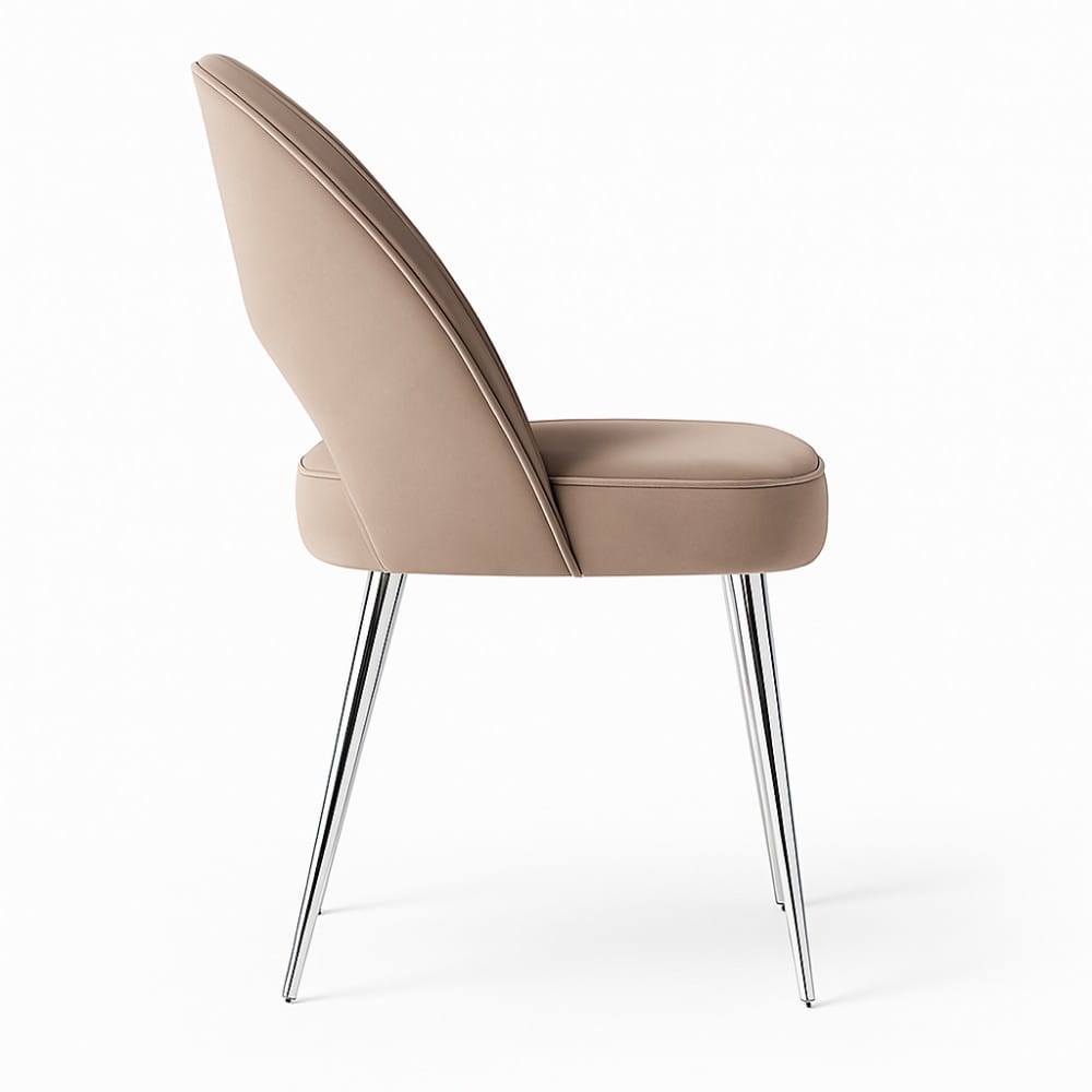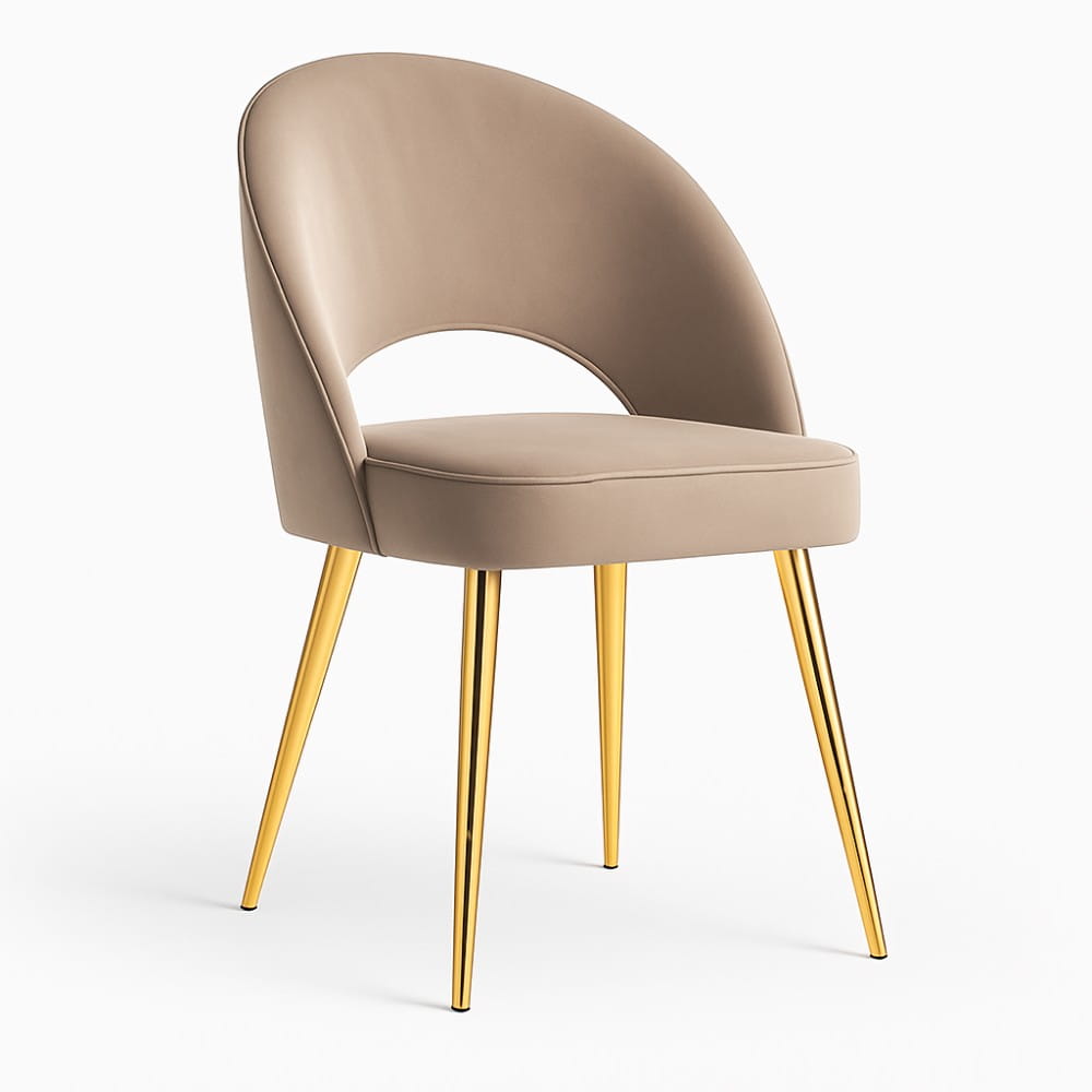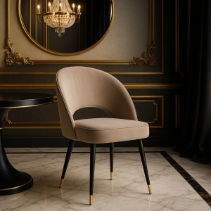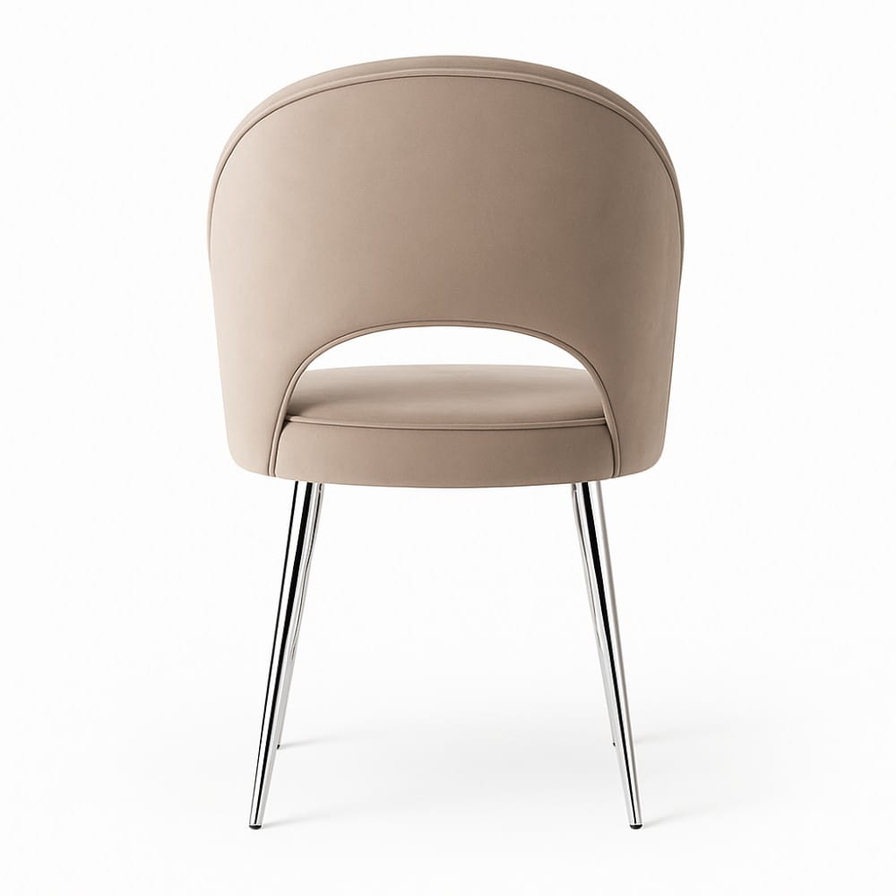 Subtelnie wygięte oparcie z dekoracyjnym wycięciem, miękkie siedzisko na piance oraz smukłe nogi z metalowym wykończeniem nadają krzesłu lekkość i klasę. Aksamit BLUVEL pięknie „pracuje” ze światłem i jest wyjątkowo odporny na codzienne użytkowanie (100 000 cykli Martindale’a).