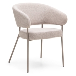 Krzesło tapicerowane LAMU to kwintesencja współczesnego stylu i komfortu. Delikatna tkanina boucle w odcieniu beżu i subtelne, metalowe nogi w tym samym kolorze tworzą niezwykle elegancki duet.