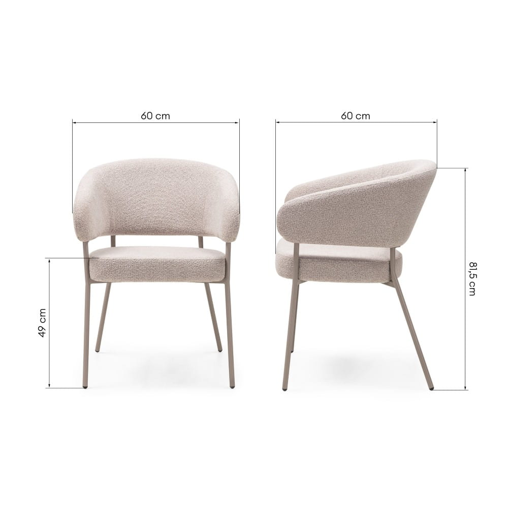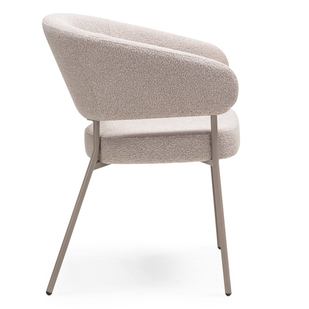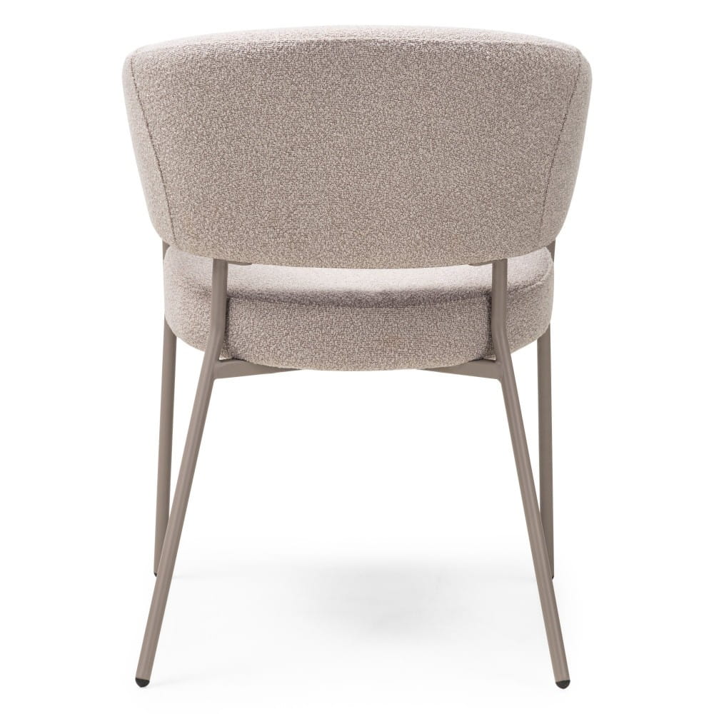 Stelaż krzesła wykonano z malowanego proszkowo metalu w kolorze spójnym z tkaniną – beżowym. To rozwiązanie nie tylko estetyczne, ale też wyjątkowo trwałe. Smukłe, lekko rozstawione nogi nadają bryle lekkości i nowoczesnego charakteru.