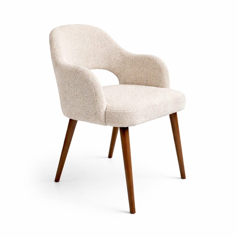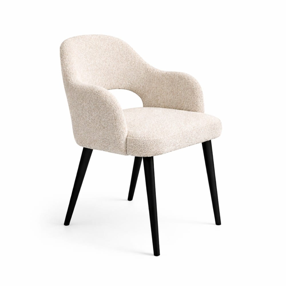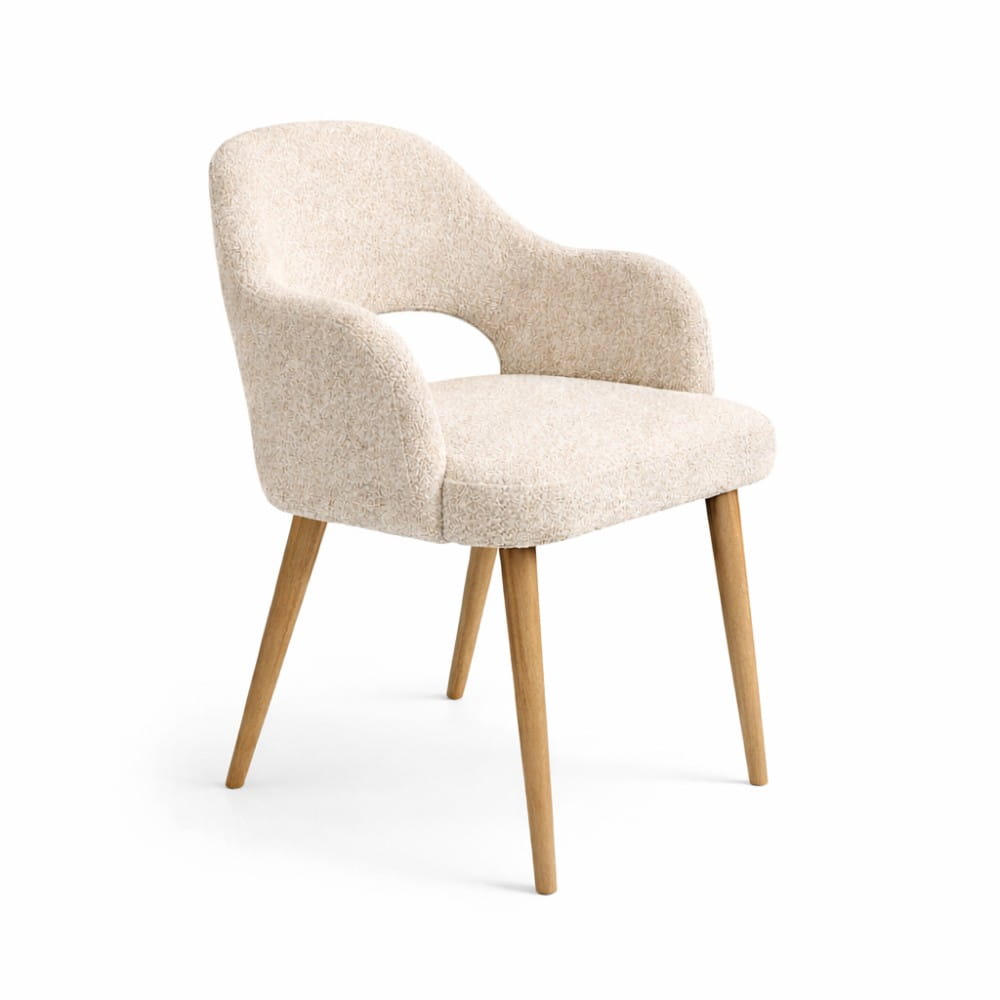 Krzesło Melia to połączenie tapicerowanego komfortu z naturalnym drewnem. Podłokietniki wprowadzają stabilność i wyraźnie podnoszą wygodę użytkowania, jednocześnie nadając całości elegancki charakter. To model, który buduje przestrzeń bardziej świadomie – daje wygodę, ale też mocniej „rysuje” strefę jadalni lub spotkań.
