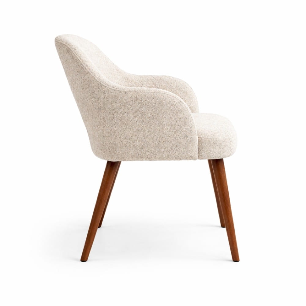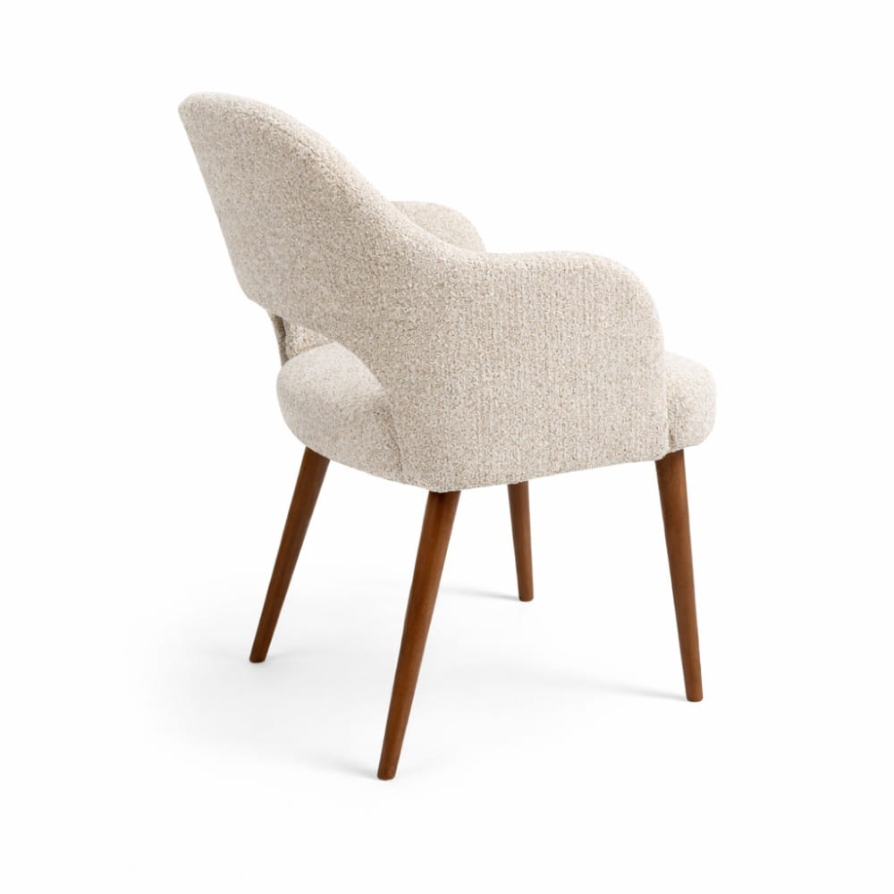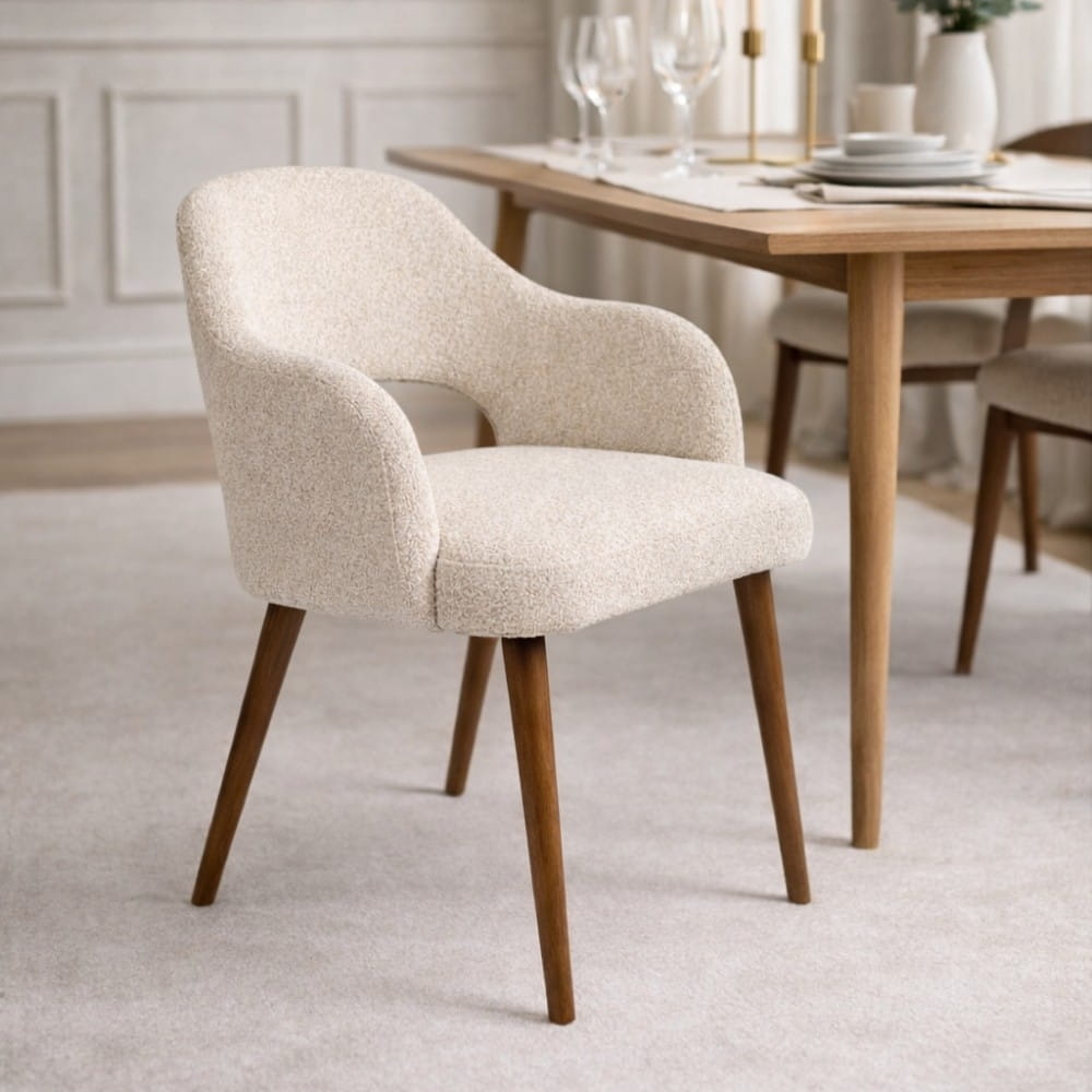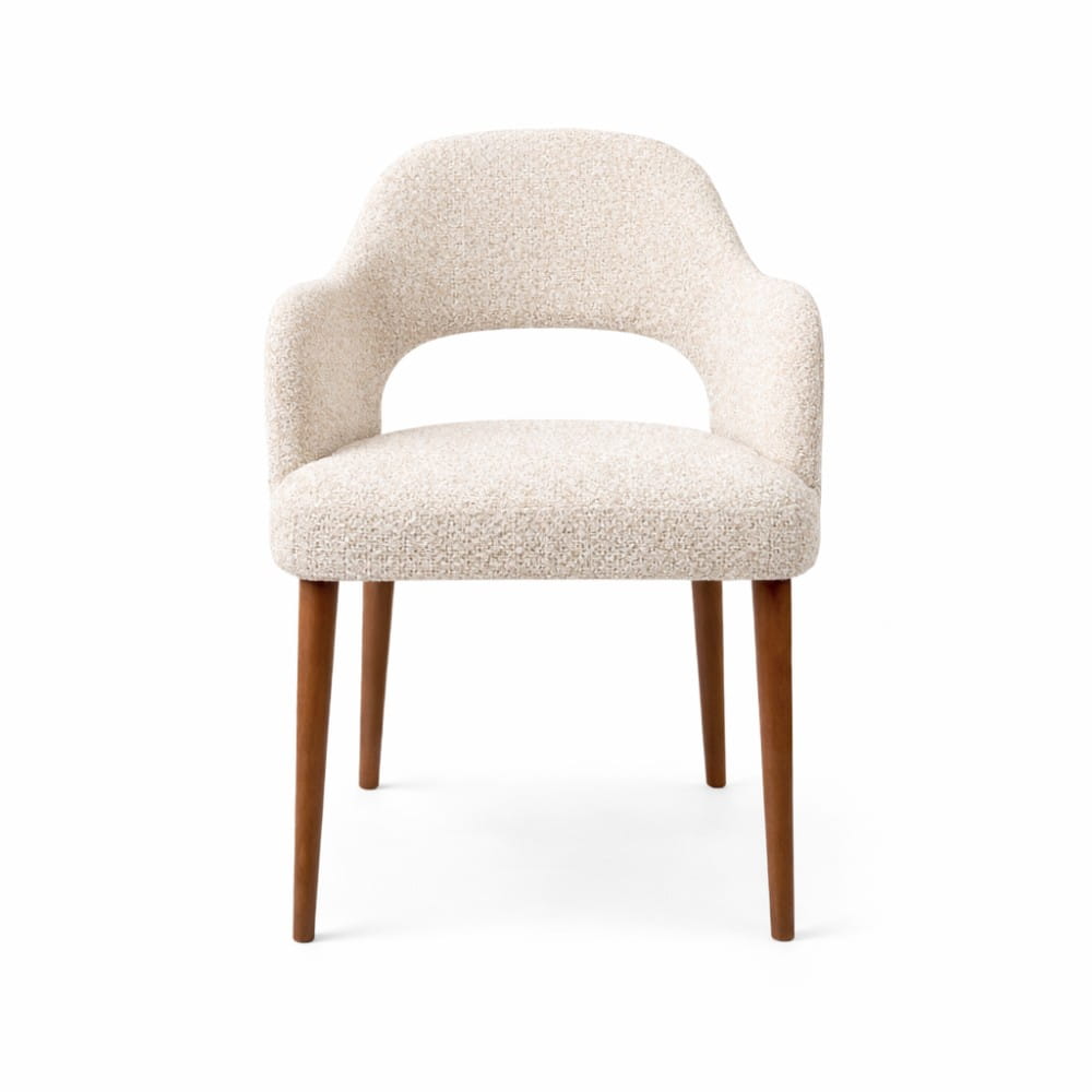 Krzesło Melia to połączenie tapicerowanego komfortu z naturalnym drewnem. Podłokietniki wprowadzają stabilność i wyraźnie podnoszą wygodę użytkowania, jednocześnie nadając całości elegancki charakter. To model, który buduje przestrzeń bardziej świadomie – daje wygodę, ale też mocniej „rysuje” strefę jadalni lub spotkań.