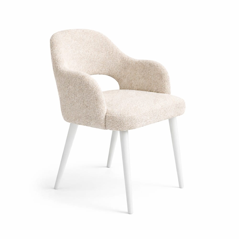 Melia to krzesło, które łączy miękką tapicerkę z naturalnym detalem podłokietników. Dzięki temu zyskuje bardziej dopracowany, premium charakter i lepiej definiuje przestrzeń przy stole.