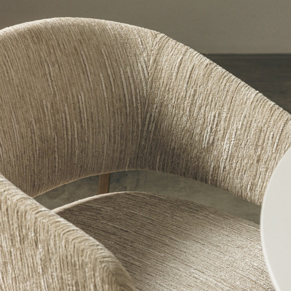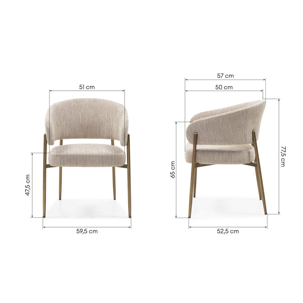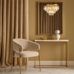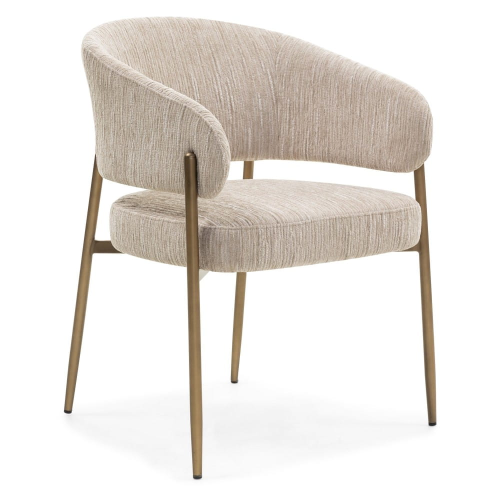 UMBRA to wyjątkowe krzesło stworzone z myślą o wnętrzach pełnych szyku i subtelnego blasku. Beżowa tapicerka o delikatnej strukturze, połączona ze smukłymi nogami w kolorze mosiądzu, tworzy luksusowy efekt, który idealnie wpisuje się w klimat glamour i modern elegance.