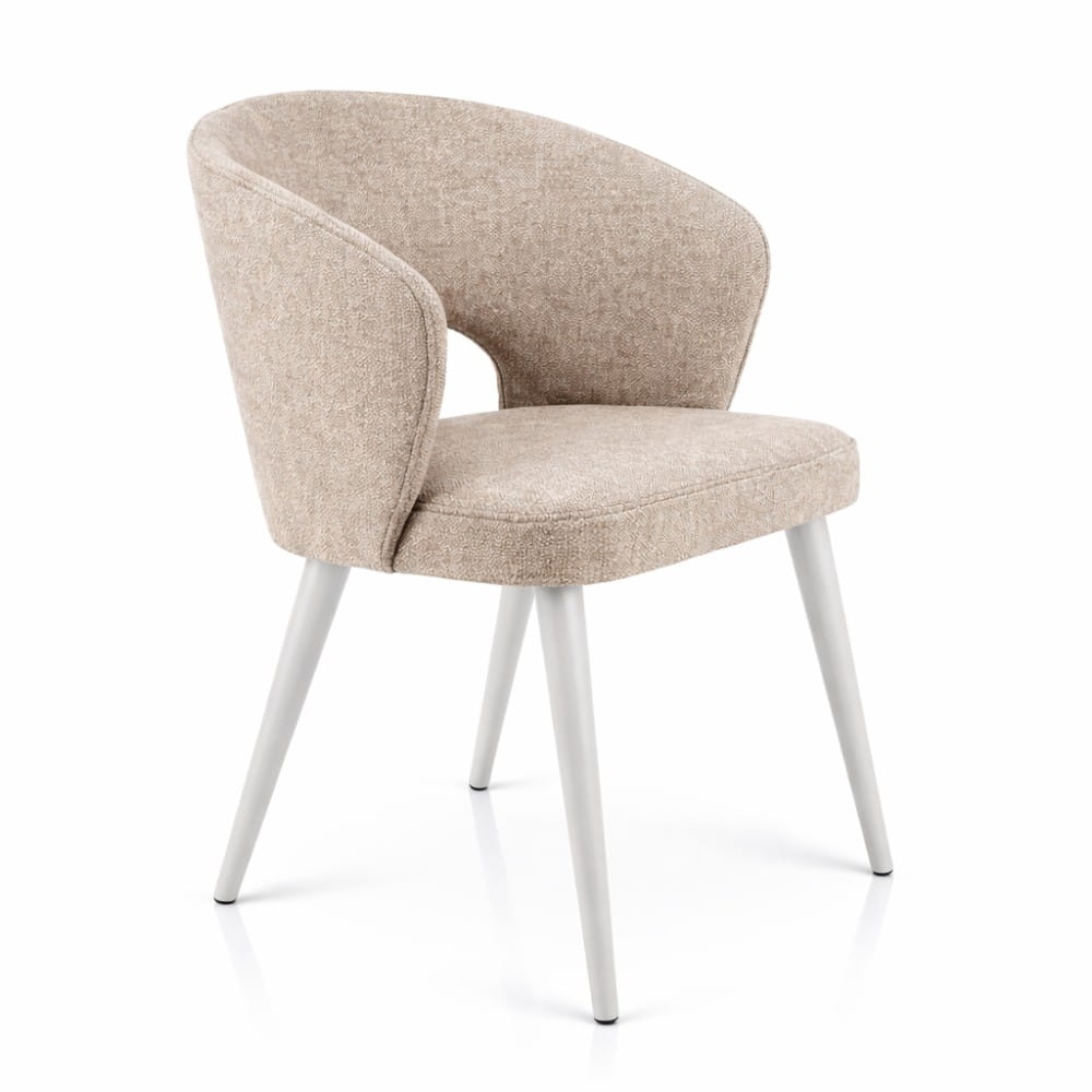 VENTO łączy wygodę fotela z lekkością krzesła jadalnianego. Zaokrąglone oparcie zapewnia komfortowe podparcie pleców, a podłokietniki zwiększają wygodę podczas dłuższego siedzenia przy stole.