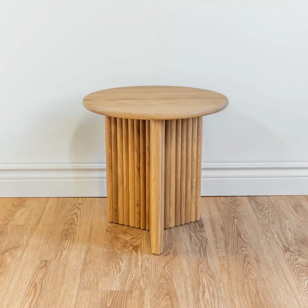 Ten elegancki stolik pomocniczy, wykonany z litego dębu, łączy w sobie funkcjonalność i stylowy design. Jego okrągły blat oraz ryflowana podstawa sprawiają, że jest idealnym dodatkiem do każdego wnętrza.