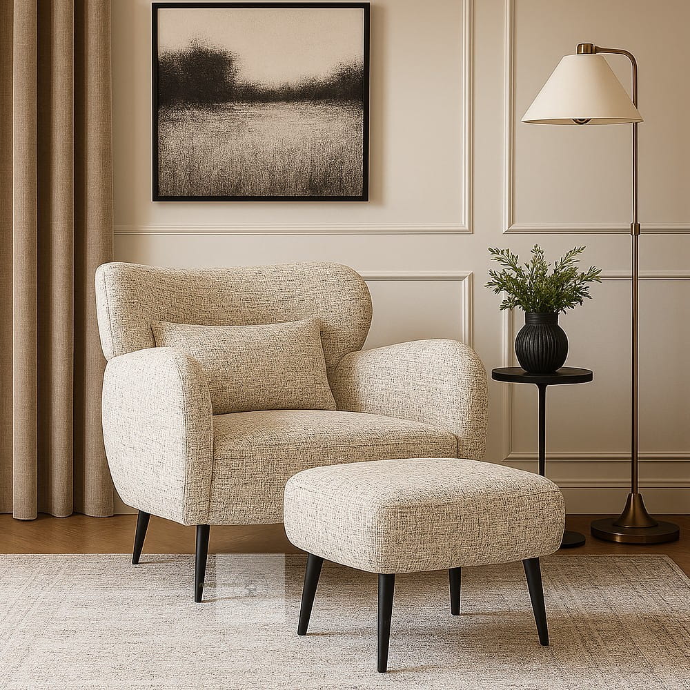 Połączenie fotela i podnóżka tworzy kompletną strefę relaksu, która zwiększa komfort i podnosi wartość aranżacji.