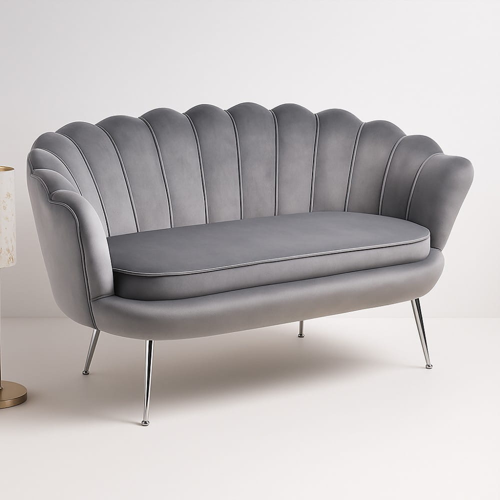 Sofa Muszelka Szara to elegancka, miękka bryła o dekoracyjnym oparciu w kształcie muszli. Subtelny odcień szarości wprowadza do wnętrza spokój i nowoczesną harmonię, doskonale łącząc się z drewnem, marmurem i jasnymi aranżacjami. Zaokrąglone linie, komfortowe siedzisko i otulająca forma sprawiają, że sofa jest zarówno wyrazistym elementem wystroju, jak i wygodnym miejscem codziennego wypoczynku. tapicerka stała • nogi: czarne / złote / srebrne • elegancki styl glamour & modern classic