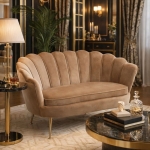 Sofa Muszelka Cappuccino to elegancka, miękka bryła o charakterystycznym oparciu w formie muszli. Ciepły kawowy odcień pięknie współgra z drewnem, jasnymi wnętrzami i stylami modern classic oraz soft glamour. To gotowy model importowany — bez oczekiwania na produkcję. Komfortowe siedzisko i dekoracyjna forma sprawiają, że sofa jest zarówno ozdobą wnętrza, jak i wygodnym miejscem codziennego odpoczynku. tapicerka stała • nogi: czarne / złote / srebrne