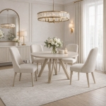 BRENNA to stół, który łączy spokojną, naturalną estetykę z funkcjonalnością na co dzień. Okrągła forma sprzyja rozmowom, a możliwość rozłożenia sprawia, że łatwo dopasowuje się do rytmu życia – od codziennych posiłków po większe spotkania.