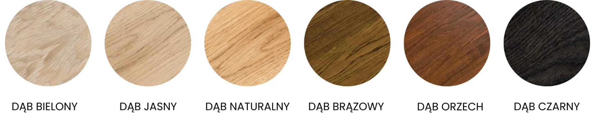 Dla 4 osób polecamy Ø110–120 cm; dla 6 osób Ø130–140 cm; dla 8 osób Ø150–160 cm (w zależności od szerokości krzeseł i układu pomieszczenia). Odcień dębu dopasujesz, zamawiając nasz wzornik drewna.