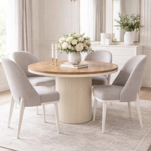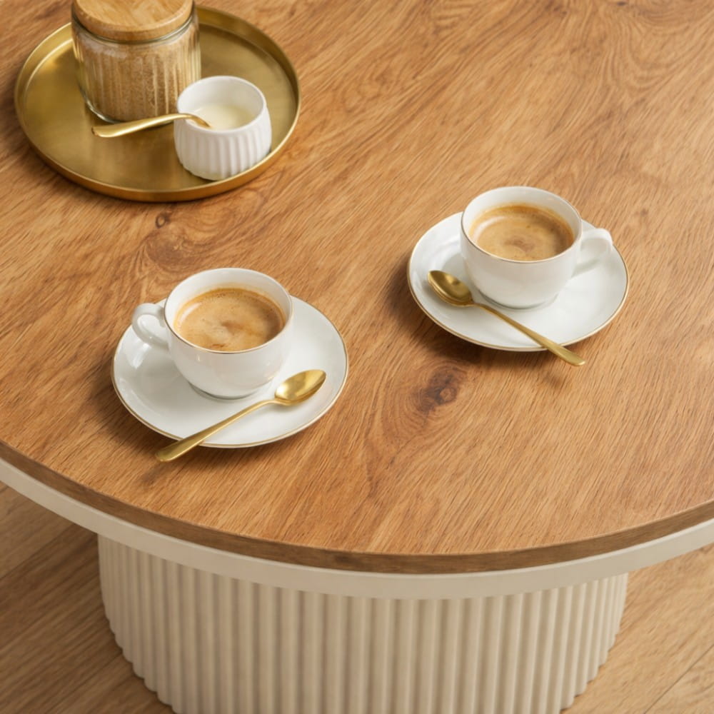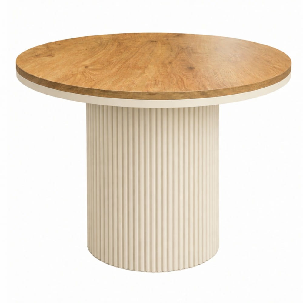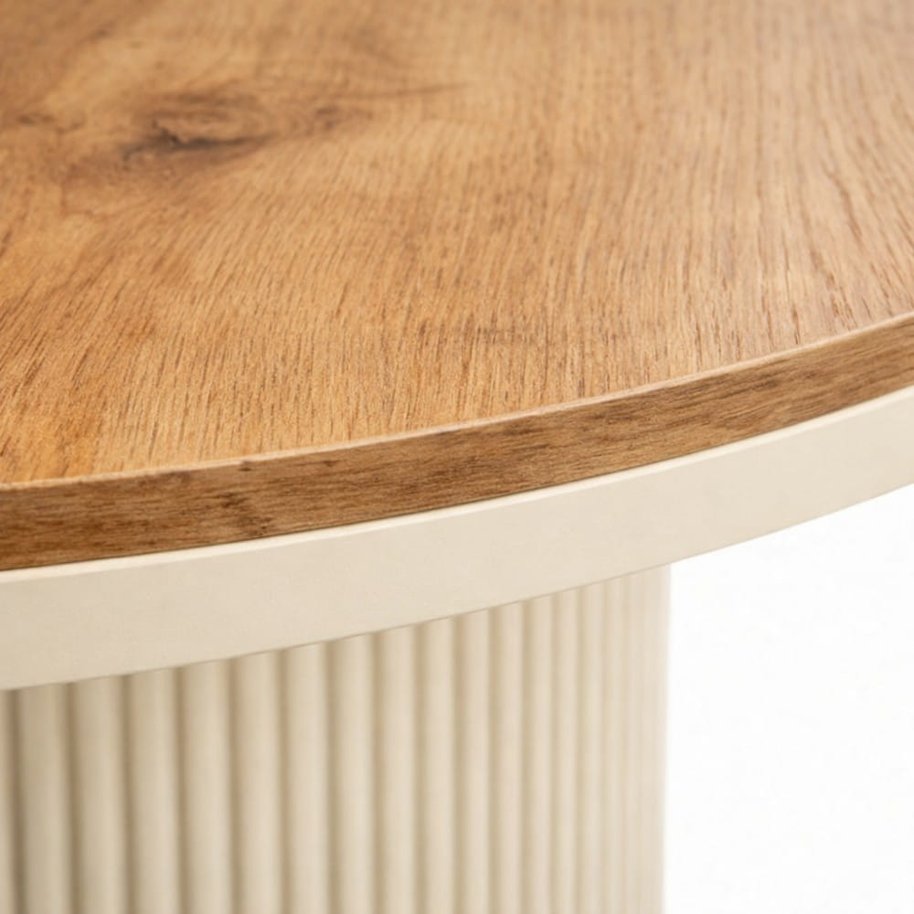 Model DIONE w wersji Cashmere (RAL 9002) to nowoczesna interpretacja stołu okrągłego do jadalni premium. Architektoniczna, ryflowana noga w kolorze kaszmirowym łączy się z naturalnym fornirem dębowym, tworząc harmonijną kompozycję formy i materiału.