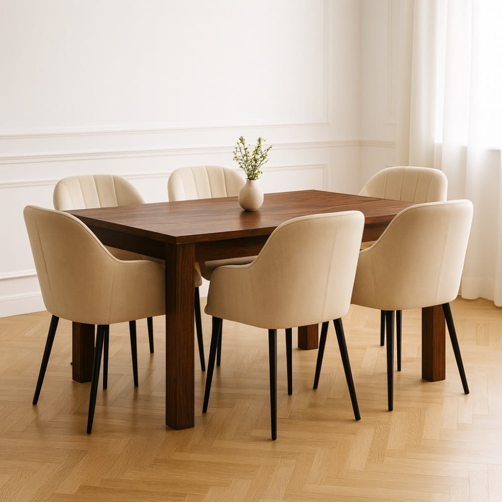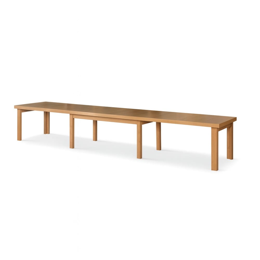Duże spotkania, rodzinne przyjęcia, święta — ten stół rośnie razem z planem. Prowadnica teleskopowa i moduły co 50 cm pozwalają osiągnąć nawet 560 cm. Fornir dębowy na blacie, nogi z litego dębu, wykończenie lakierem PU.