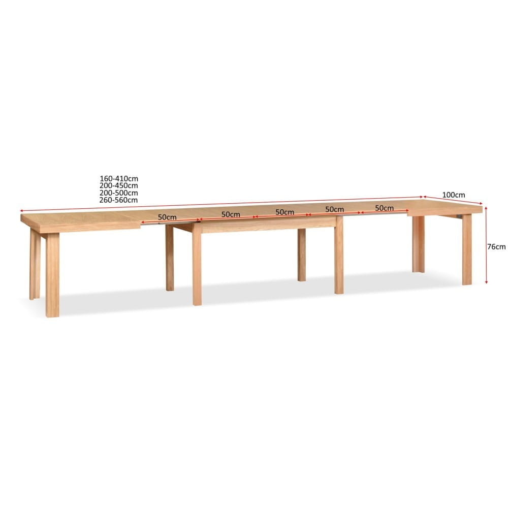 EVA w fornirze dębowym z rozkładem 200–500 cm: prowadnica teleskopowa, moduły co 50 cm, lakier PU odporny na zarysowania i nogi z litego dębu. Wybierz głębokość 90 lub 100 cm.