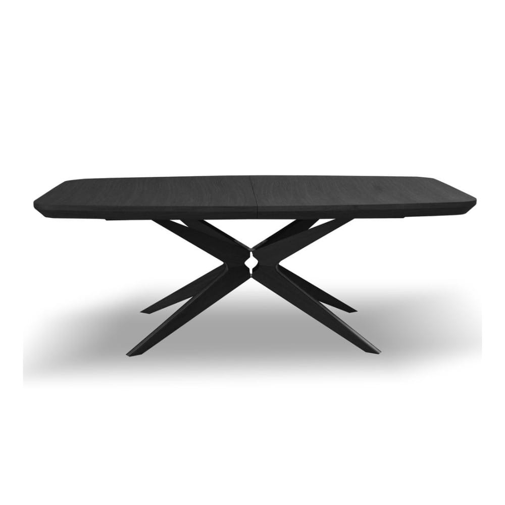 Elegancki stół z czarnym fornirem dębowym i nogami z litego dębu. Synchroniczny mechanizm wydłuża blat do 250 / 300 cm. Lakier PU chroni powierzchnię; słoje dębu pozostają widoczne.