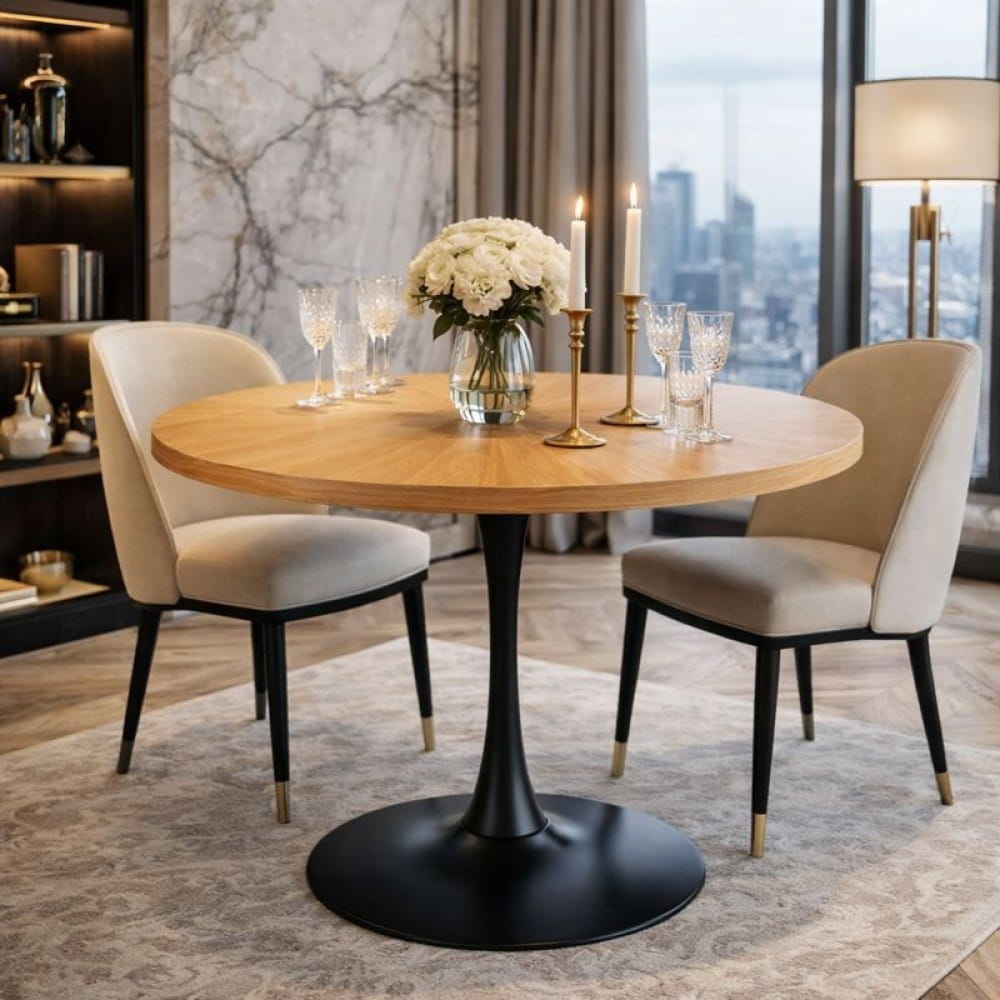 TULIA to kolekcja dla osób, które lubią czyste formy i mocne wykończenia. Okrągły stół 100 cm łączy ciepło dębu naturalnego z elegancką, czarną podstawą, dzięki czemu wygląda nowocześnie, ale nadal “domowo”. To świetny wybór do jadalni, kuchni z aneksem albo strefy spotkań – również w przestrzeniach premium (kawiarnia, butik, apart-hotel).