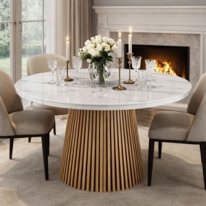 Stół okrągły rozkładany VALENTI 120 cm – biały marmur, dąb naturalny