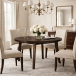 VELORA to stół, który w naturalny sposób porządkuje przestrzeń. Okrągły blat sprzyja rozmowie i bliskości, a spokojna forma doskonale odnajduje się w jadalniach urządzonych w stylu modern classic, japandi i contemporary wood.
