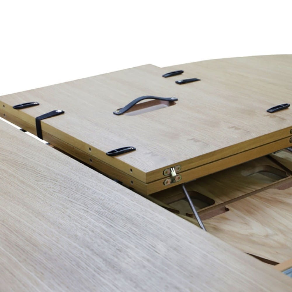 Model POLA OAK ma średnicę 130 cm i został wyposażony w praktyczną wkładkę powiększającą o 50 cm, którą można łatwo schować pod blatem. System rozkładania jest intuicyjny i stabilny – idealny na większe spotkania czy rodzinne obiady.