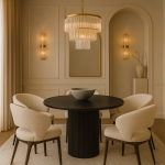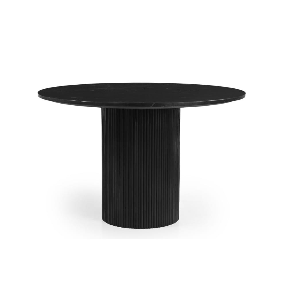 Wersja ROMA z czarnym marmurem i dopasowaną, czarną podstawą to esencja nowoczesnej, monochromatycznej elegancji. Delikatne żyłkowanie dodaje głębi, poler pięknie odbija światło. Średnica Ø120 cm – komfort 4–6 miejsc.
