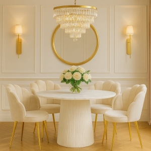 Stół jadalniany Scanno łączy biały marmur z bieloną podstawą z mango. Okrągły blat Ø120 cm sprzyja rozmowie i równomiernemu ustawieniu miejsc. Wysokość ok. 75–76 cm.