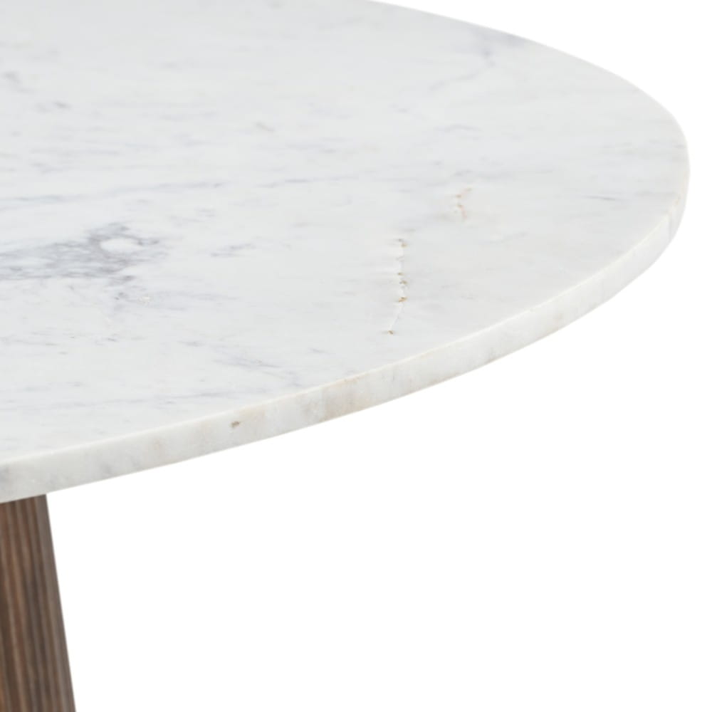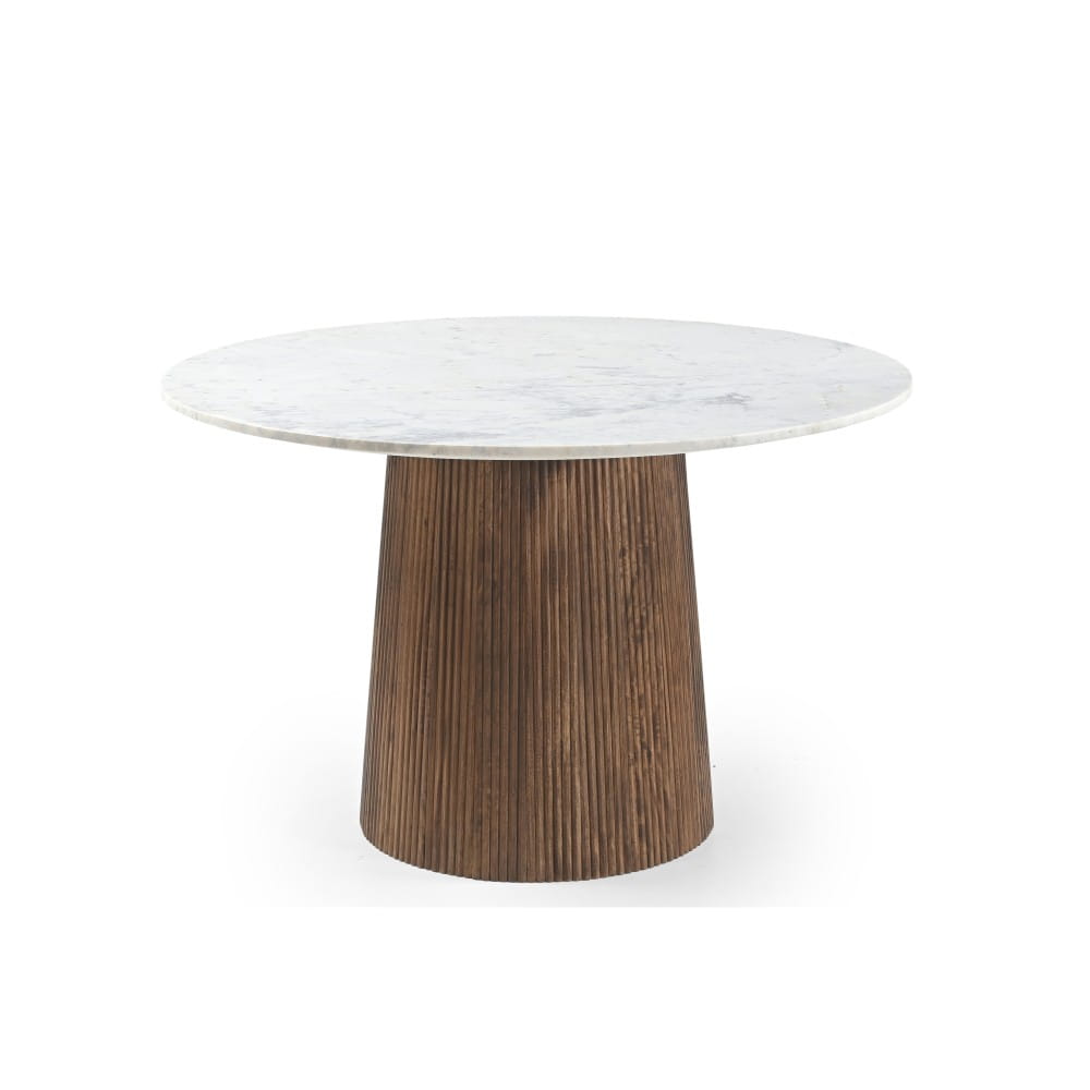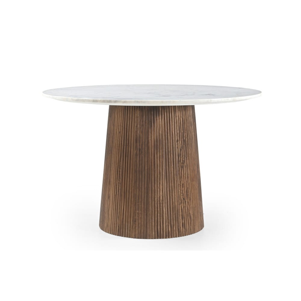 Scanno – okrągły stół jadalniany z białym marmurem na blacie i brązową podstawą z drewna mango. Średnica Ø120 cm, wysokość ok. 75–76 cm. Szybka wysyłka. Komfortowo dla 4–6 osób.