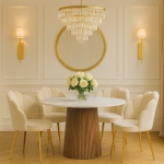 Biały marmur rozjaśnia wnętrze, a brązowa baza ociepla kompozycję. Dobieraj krzesła w tkaninach boucle, welur, zamsz — kolory beż, ecru, taupe.