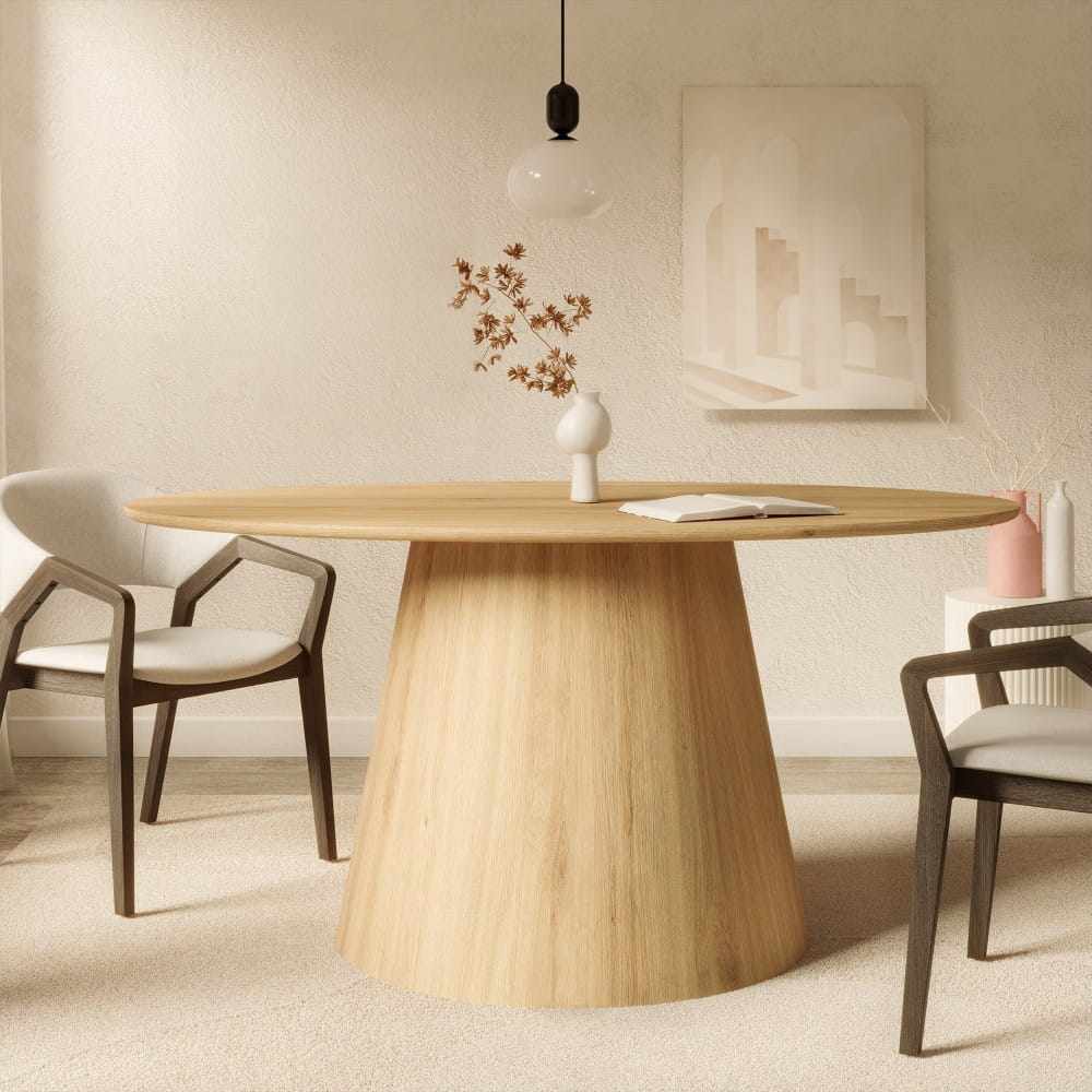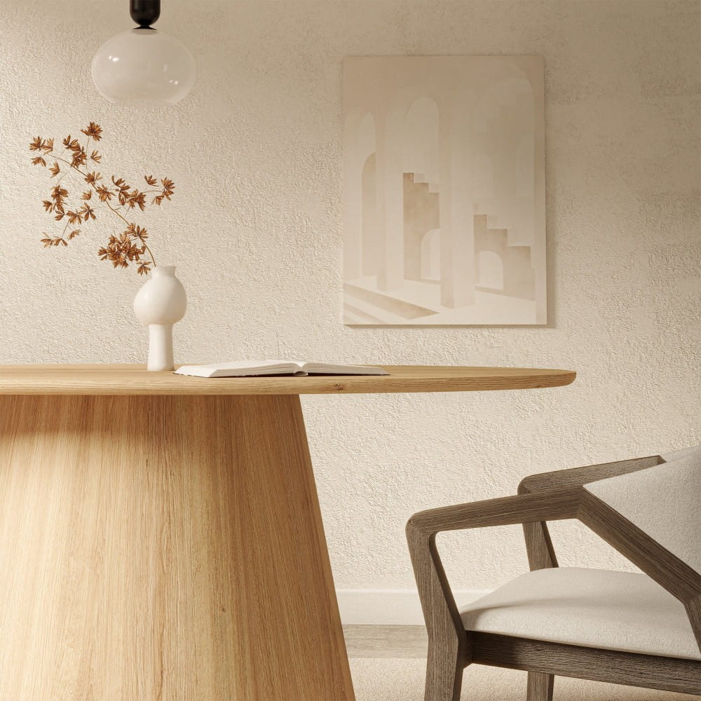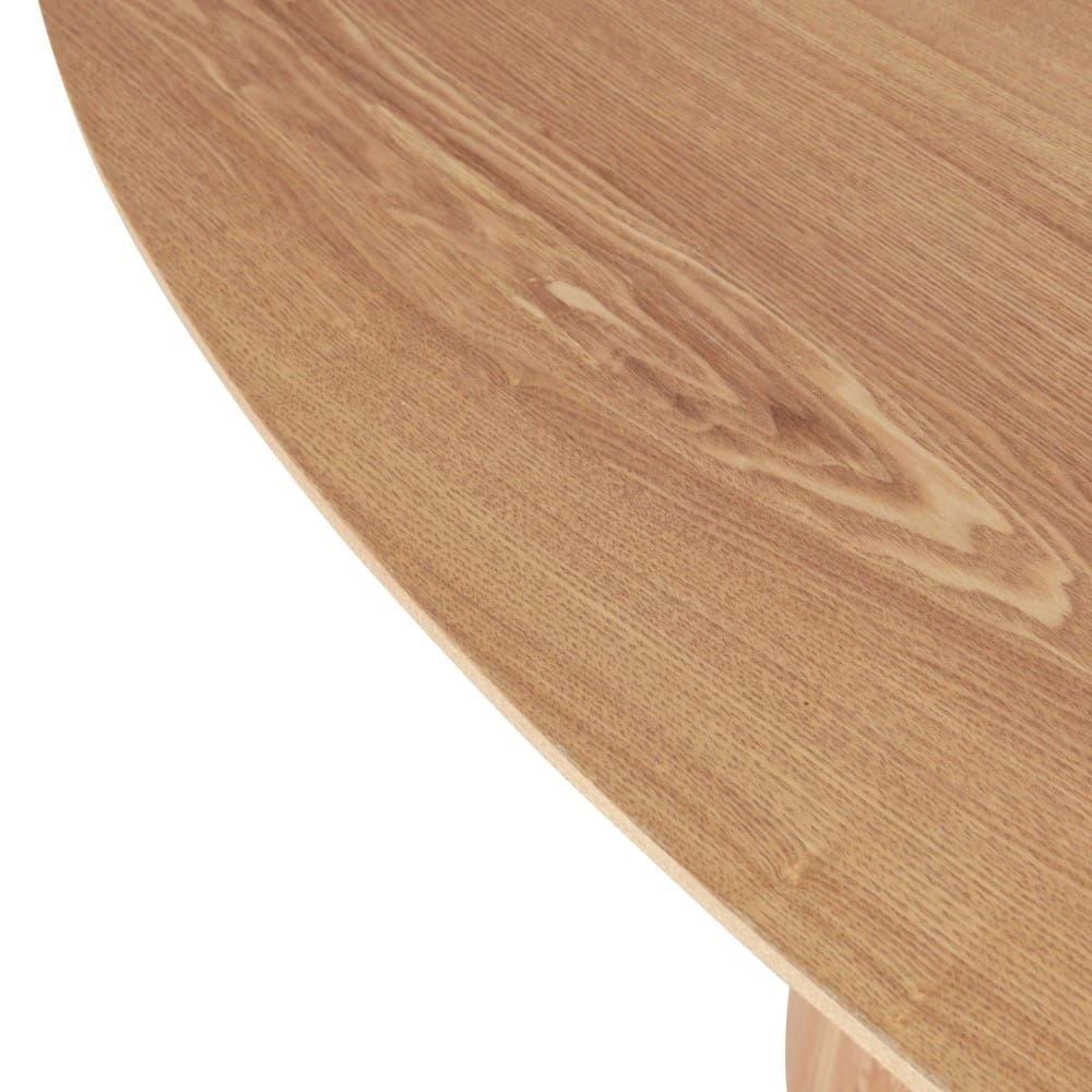 Wykonany z płyty MDF i pokryty naturalnym fornirem jesionowym, stół emanuje ciepłem drewna, jednocześnie zachowując trwałość i odporność na codzienne użytkowanie. To doskonały wybór do wnętrz urządzonych w stylu skandynawskim, japandi czy nowoczesnym.