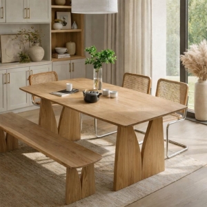 Vita to stół zaprojektowany jako centralny punkt jadalni lub przestrzeni dziennej. Jego forma łączy nowoczesne wzornictwo z naturalnym pięknem litego drewna. Charakterystyczna podstawa w formie łuku nadaje bryle lekkości, zachowując stabilność i komfort codziennego użytkowania.