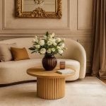 Model Belliso to okrągły stolik kawowy z litego dębu, osadzony na stabilnej ryflowanej podstawie. Minimalistyczna, a jednocześnie elegancka forma sprawdzi się w salonie, przestrzeni dziennej i wnętrzach w stylu forest living, japandi czy modern classic.