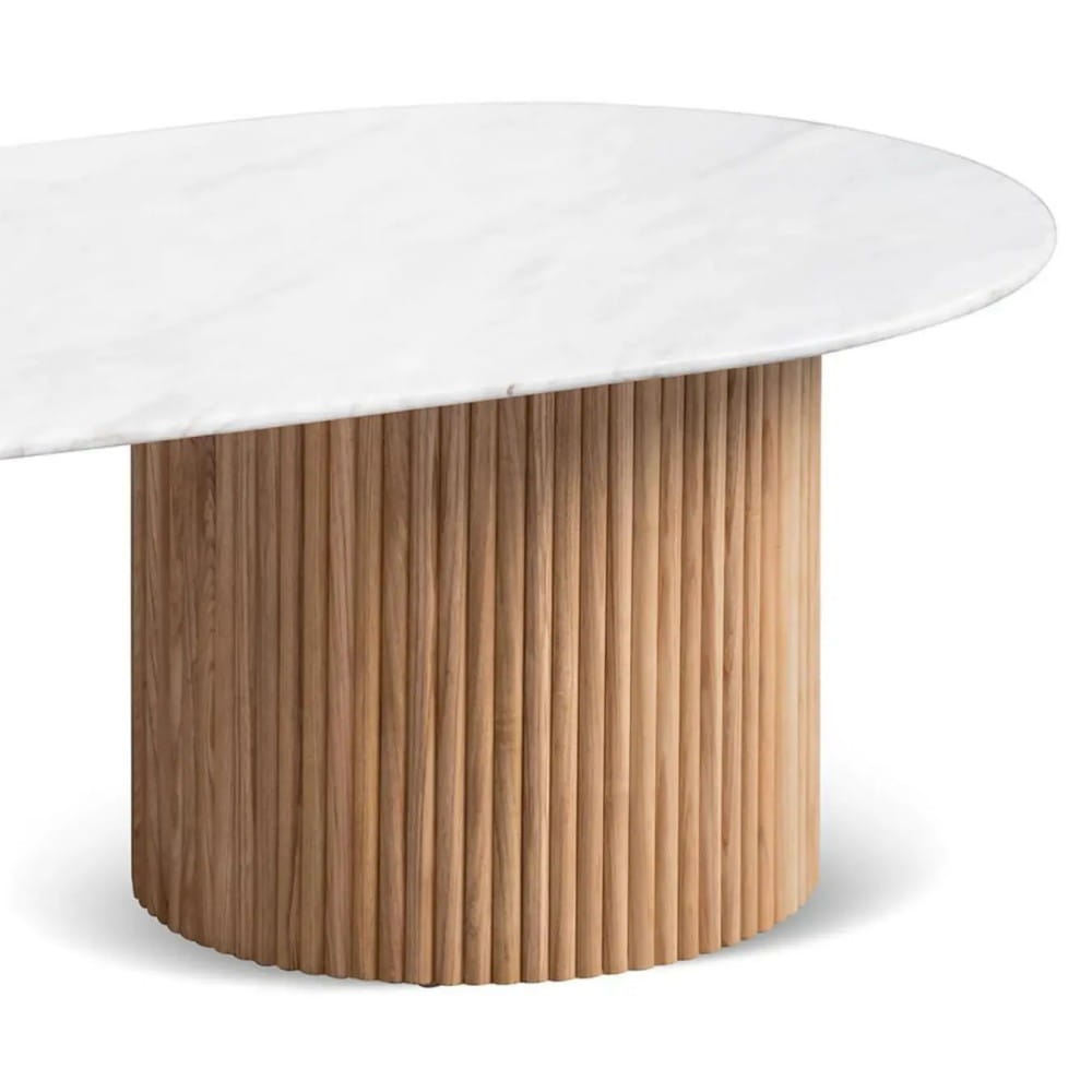 Stolik kawowy Dual to eleganckie połączenie naturalnego drewna dębowego oraz efektownego marmurowego blatu. Owalna forma o wymiarach 120x60 cm sprawia, że stolik doskonale prezentuje się w nowoczesnych salonach, apartamentach oraz przestrzeniach projektowanych przez architektów wnętrz. Harmonijne zestawienie drewna i marmuru nadaje meblowi luksusowego charakteru, a jednocześnie zachowuje ponadczasową elegancję, która idealnie komponuje się z designerskimi krzesłami i stołami z kolekcji eWoodland.