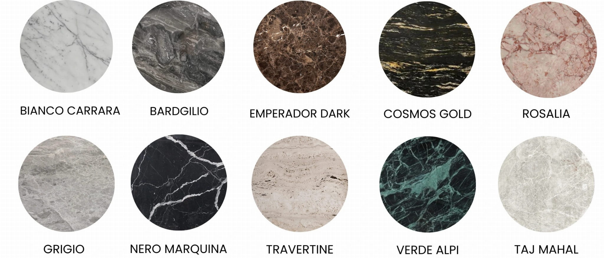 Blat wykonany z marmuru nadaje stolikowi luksusowego charakteru i podkreśla elegancję całej konstrukcji. Naturalny rysunek kamienia sprawia, że każdy egzemplarz stolika jest unikalny i posiada niepowtarzalny charakter.