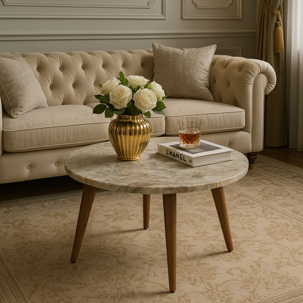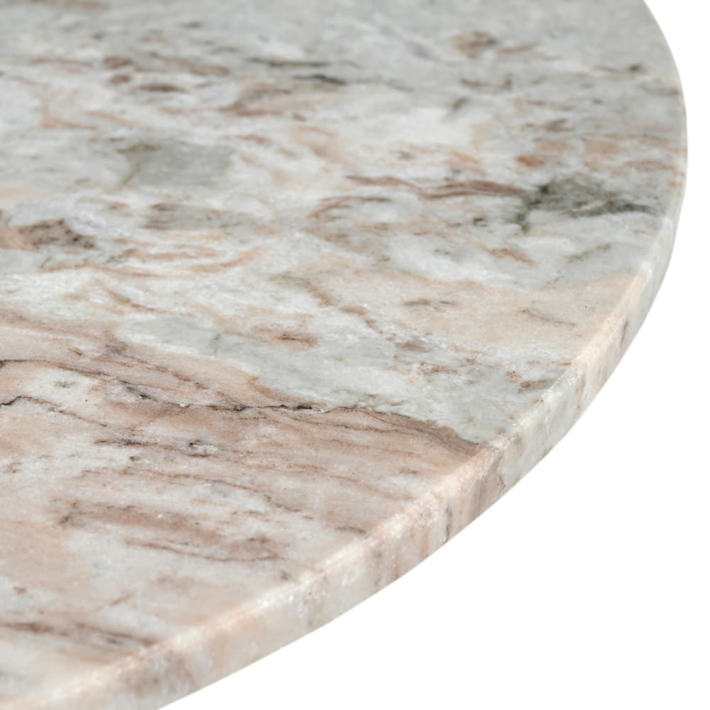 Chłodny ton szarego marmuru łączy się z ciepłem brązowego drewna mango, tworząc klasyczny, lekki wizualnie stolik. Okrągła forma Ø70 cm i wysokość 40 cm dobrze odnajdą się w salonach w duchu modern classic. Ręczne wykonanie gwarantuje charakter i unikalność.