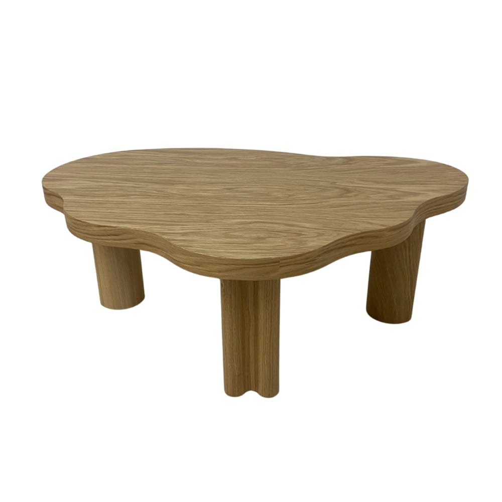 Stolik kawowy NUBE – fornir dębowy, nieregularny kształt, nogi z litego drewna. Polski projekt, wybór koloru. Styl organiczny i jakość premium.
