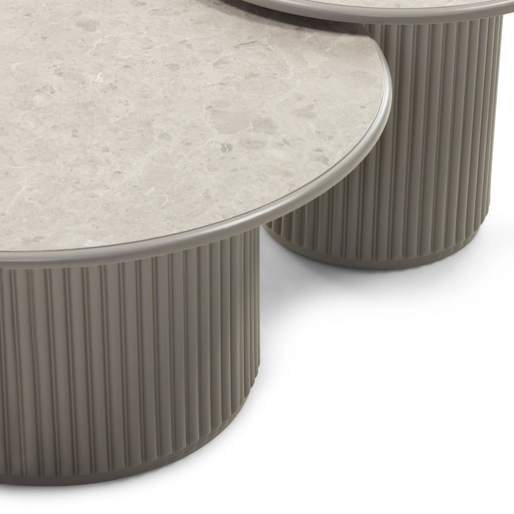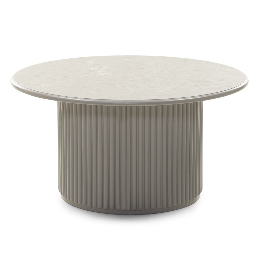 Livorno – Okrągły stolik kawowy 80 cm, szary, ryflowana podstawa, dekor marmuru