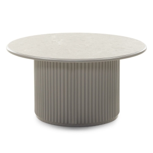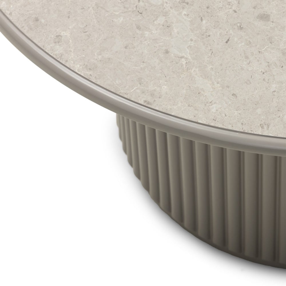 Stolik Livorno o średnicy 80 cm to połączenie marmurowego dekoru i szarej ryflowanej podstawy. Stylowy wybór do salonu w nowoczesnym lub klasycznym stylu.
