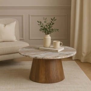 Stolik TRENTO fi 80 cm to manifest natury i rzemiosła. Blat wykonany z prawdziwego marmuru o grubości 1,8 cm urzeka strukturą kamienia i subtelnym połyskiem, a lite drewno mango wprowadza ciepło i harmonię. Dzięki wysokości 32 cm stolik sprawdza się jako centralny punkt salonu, łącząc estetykę i funkcjonalność w duchu Japandi i Modern Classic.