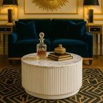 Naturalny biały marmur o subtelnym żyłkowaniu rozjaśnia przestrzeń, a białe, ryflowane drewno wprowadza ład i miękkość. Okrągła sylwetka dobrze pracuje w codziennym użytkowaniu — to elegancja Prowansji i angielskiej klasyki, z nutą modern classic.