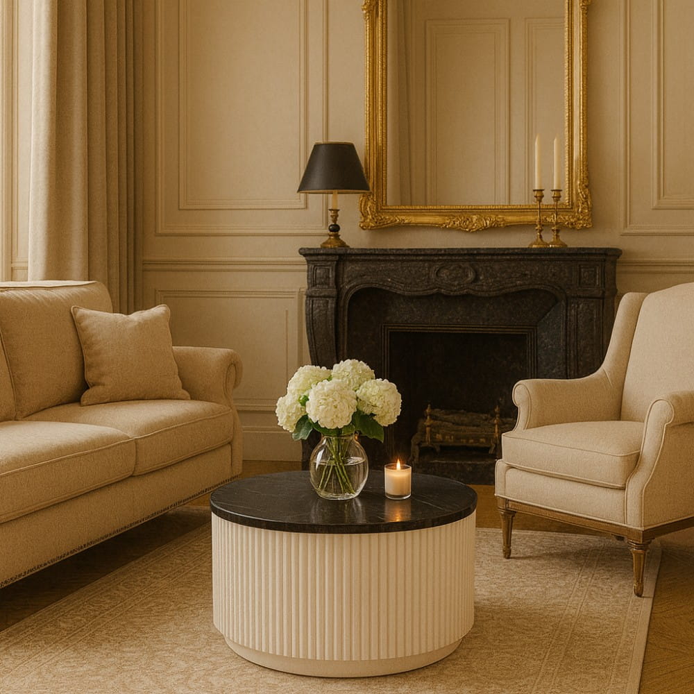 Polerowany czarny marmur o subtelnym żyłkowaniu zestawiliśmy z białą, ryflowaną bazą z drewna. Krągła linia i pionowe frezy tworzą rytm typowy dla art déco — elegancki, wyrazisty, ale wciąż lekki.
