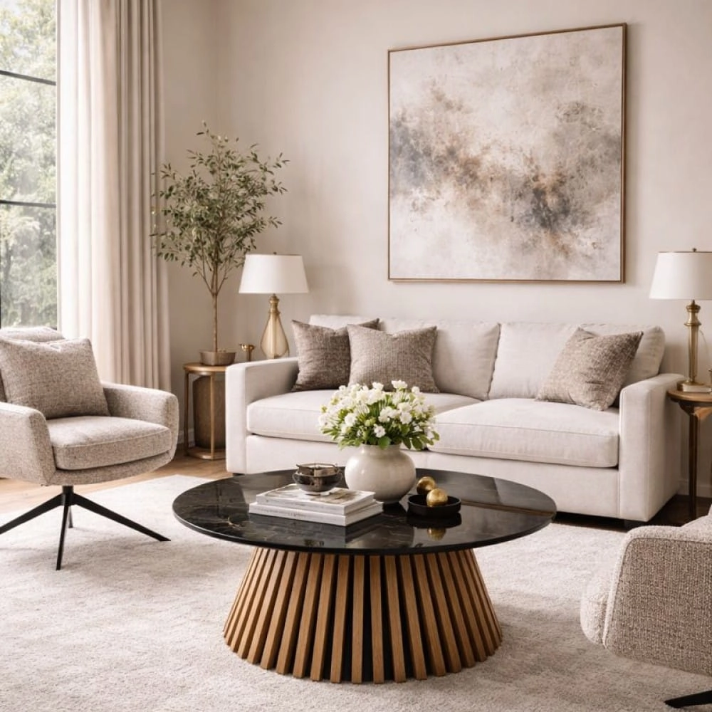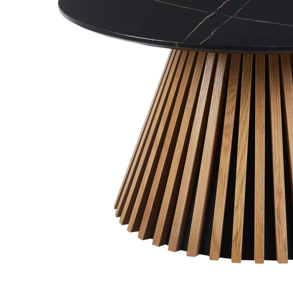 Stolik kawowy VALENTI 80 cm – czarny marmur / dąb naturalny, lamelowa podstawa, od ręki