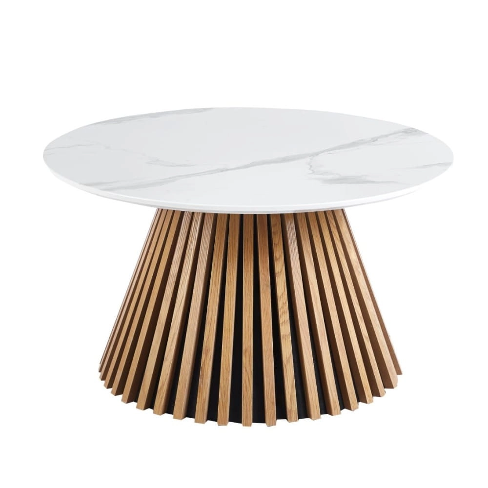 Stolik kawowy VALENTI 80 cm – biały marmur / dąb naturalny, lamelowa podstawa, od ręki