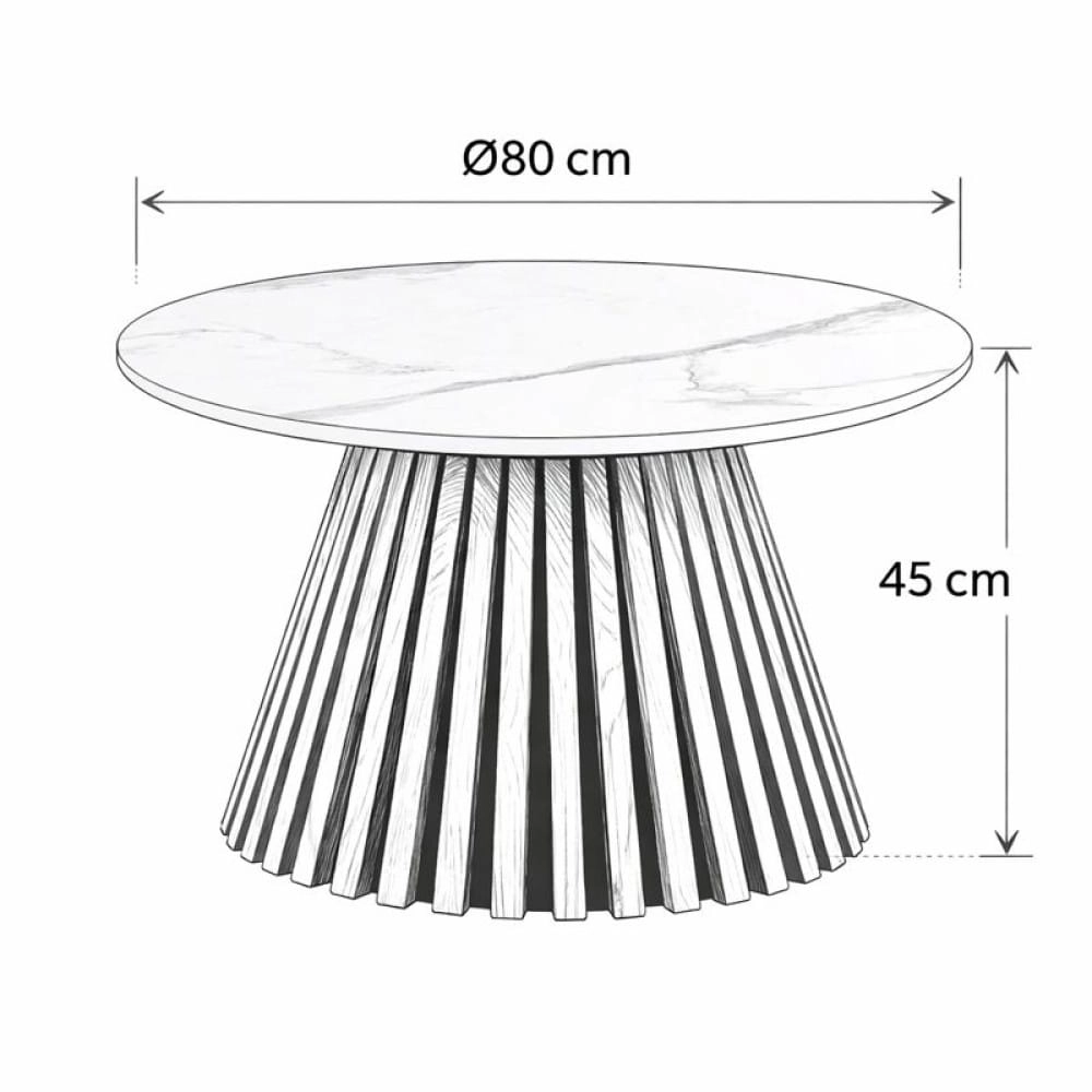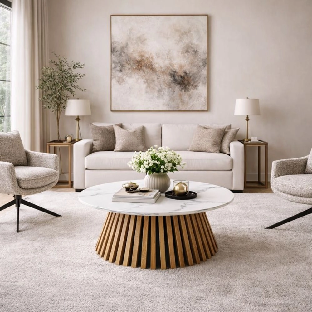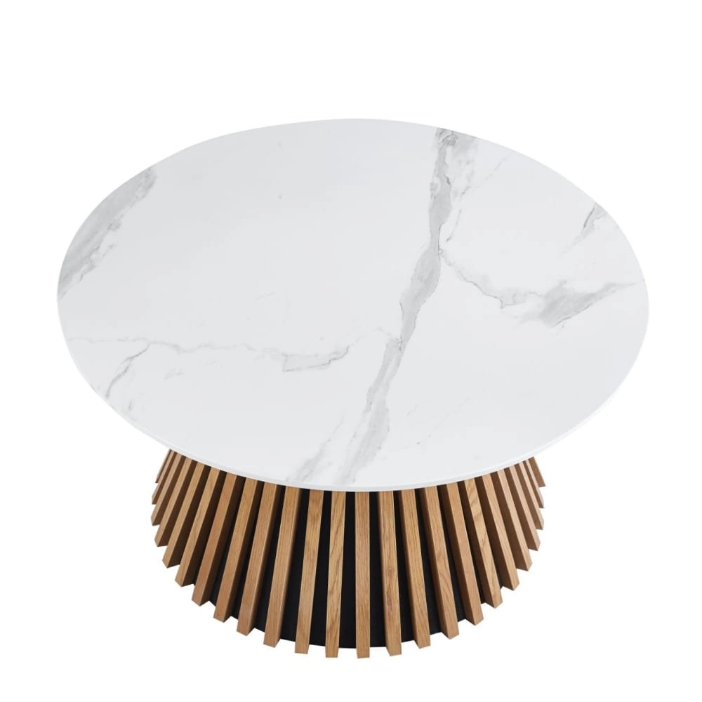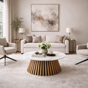 VALENTI w wersji marmurowej to elegancki stolik kawowy z blatem imitującym biały marmur i dekoracyjną podstawą z lameli w kolorze dębu naturalnego. Połączenie jasnego marmuru i ciepłego drewna tworzy efekt premium, który idealnie pasuje do wnętrz nowoczesnych, glamour i modern classic. Dostępny od ręki – szybka wysyłka.